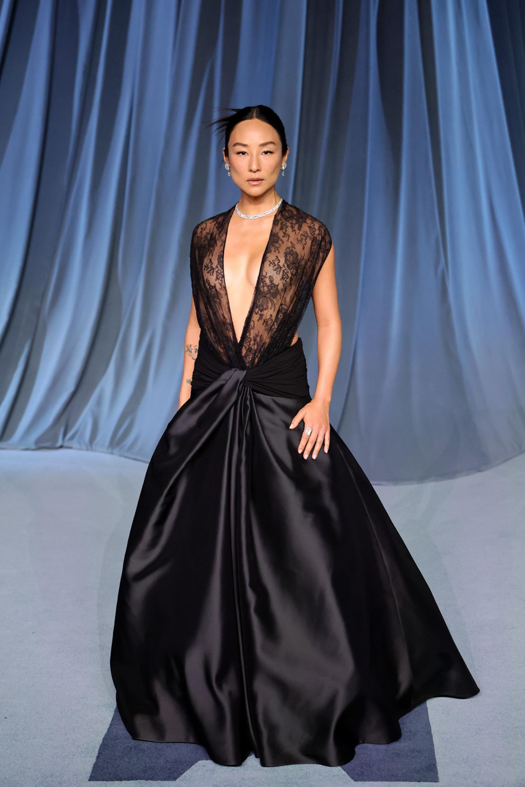 Грета Ли — новый амбассадор Dior — теперь носит только наряды, разработанные Джонатаном Андерсоном. «Лук» с кружевным лифом она надела на Гала-вечер Музея Академии.