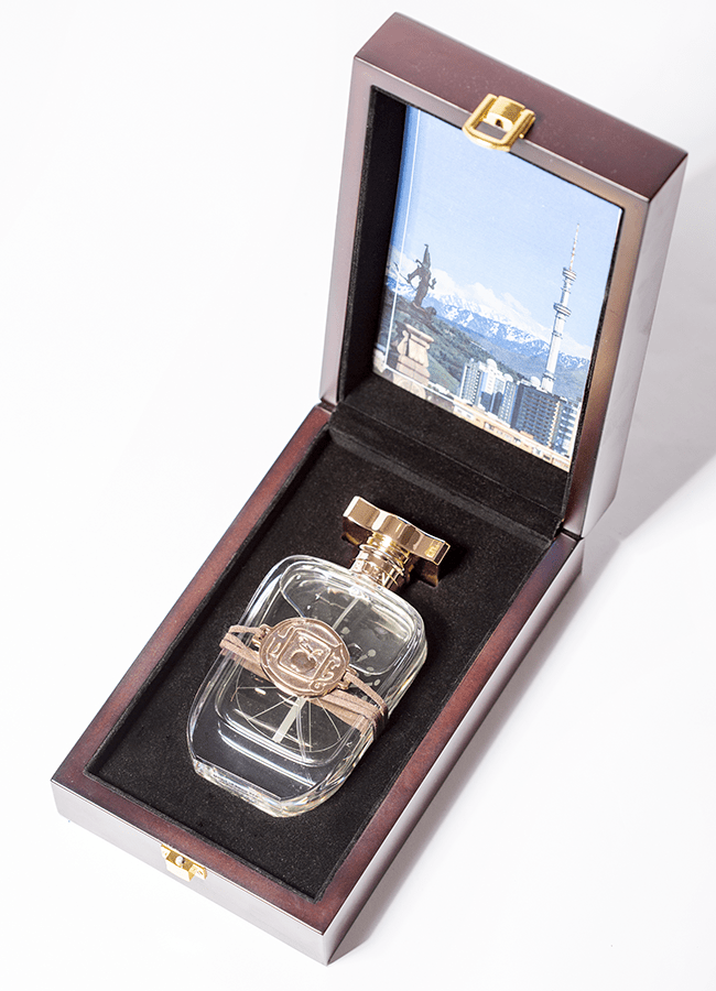 Первый казахстанский нишевый парфюмерный дом Aura of Kazakhstan располагает хоть и небольшой, но уже очень успешной и известной коллекцией ароматов. Все они посвящены родной земле, ее красотам и богатствам. Именитый британский парфюмер Сара МакКартни специально прилетела в Алматы, чтобы прочувствовать аромат города яблок. Нотки шоколада, фруктов, красных ягод, ванили и пчелиного воска собраны в аутентичном хрустальном флаконе, за который, кстати, парфюмерный дом получил высокую профессиональную награду на Fifi Awards 2020 в номинации Рackaging niche за лучший дизайн флаконов и упаковки.