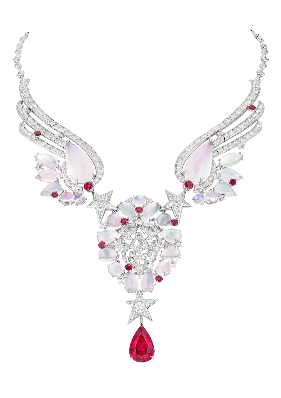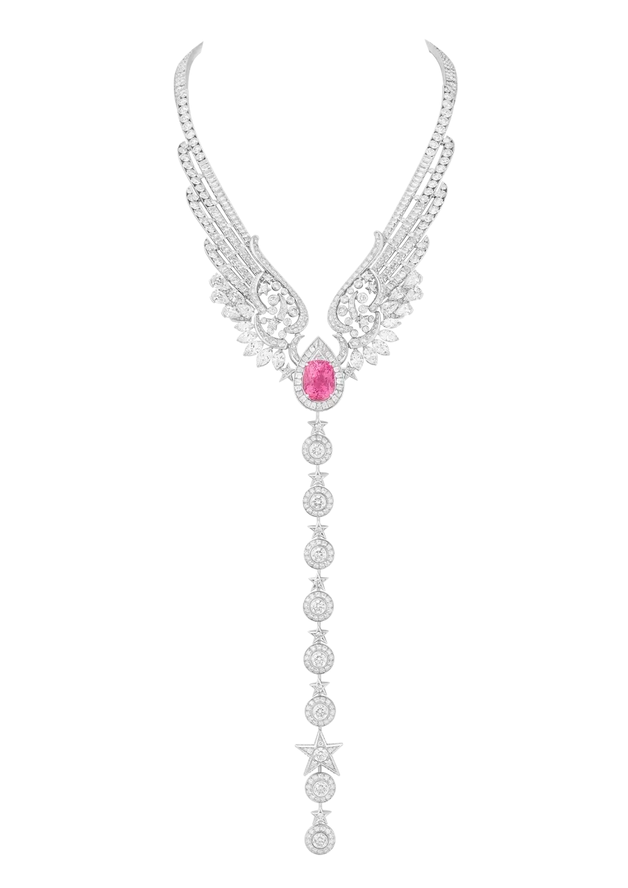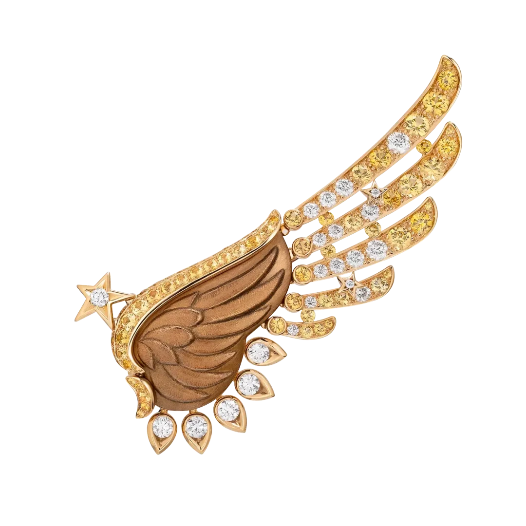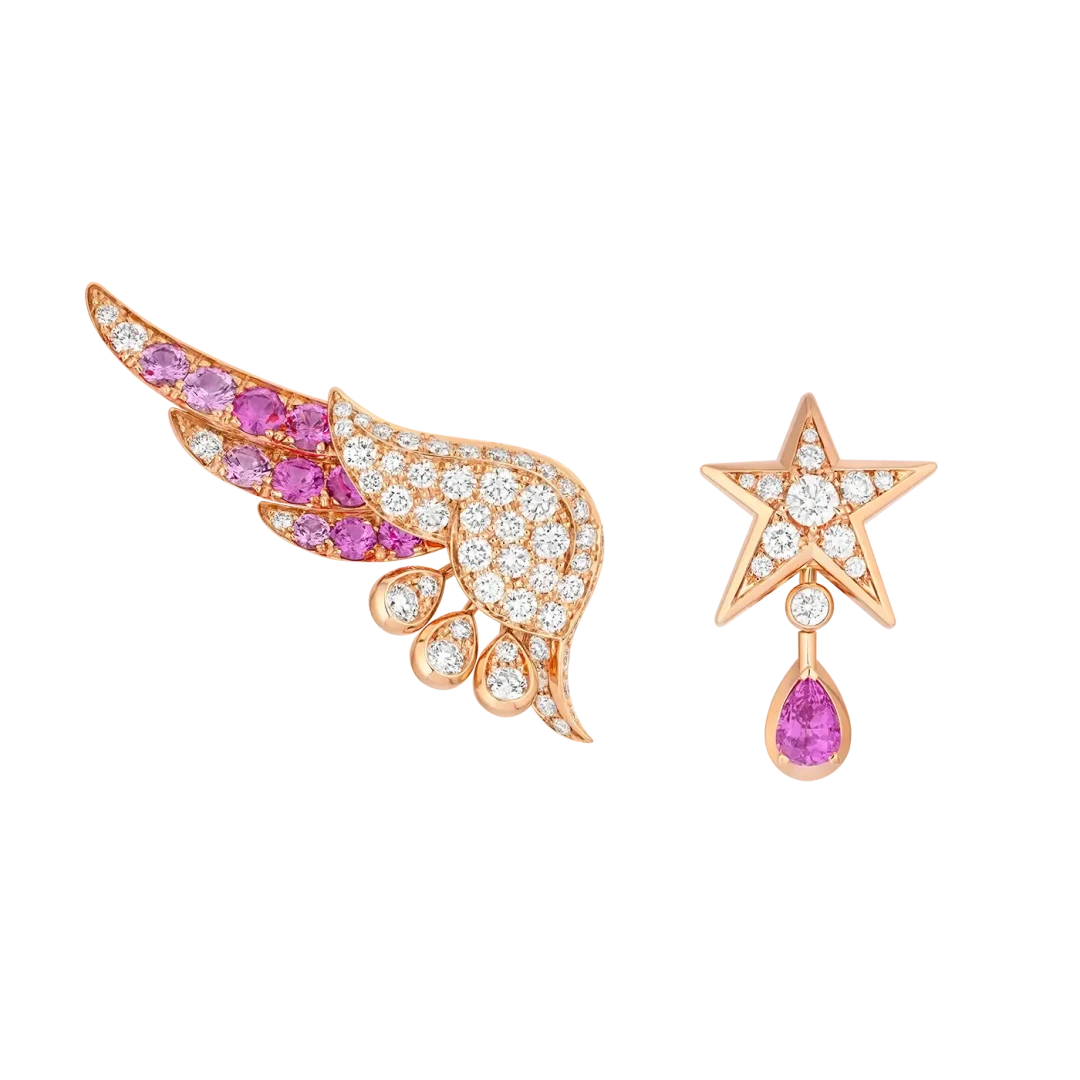 Крылья, к слову, Патрис Легеро — директор Креативной студии Дома — впервые внедрил в украшения, но зато как эффектно. Уникальный сотуар с 19,55-каратным сапфиром Padparadscha неповторимого оттенка по праву может трансформироваться. Нижняя часть снимается и превращается в браслет. Асимметричные серьги Pretty Wings и коктейльное кольцо игриво дополнят любые образы. В главу также вошли колье, броши, ожерелья и тиары, которые вдохновлены сумерками и «розовым» часом.