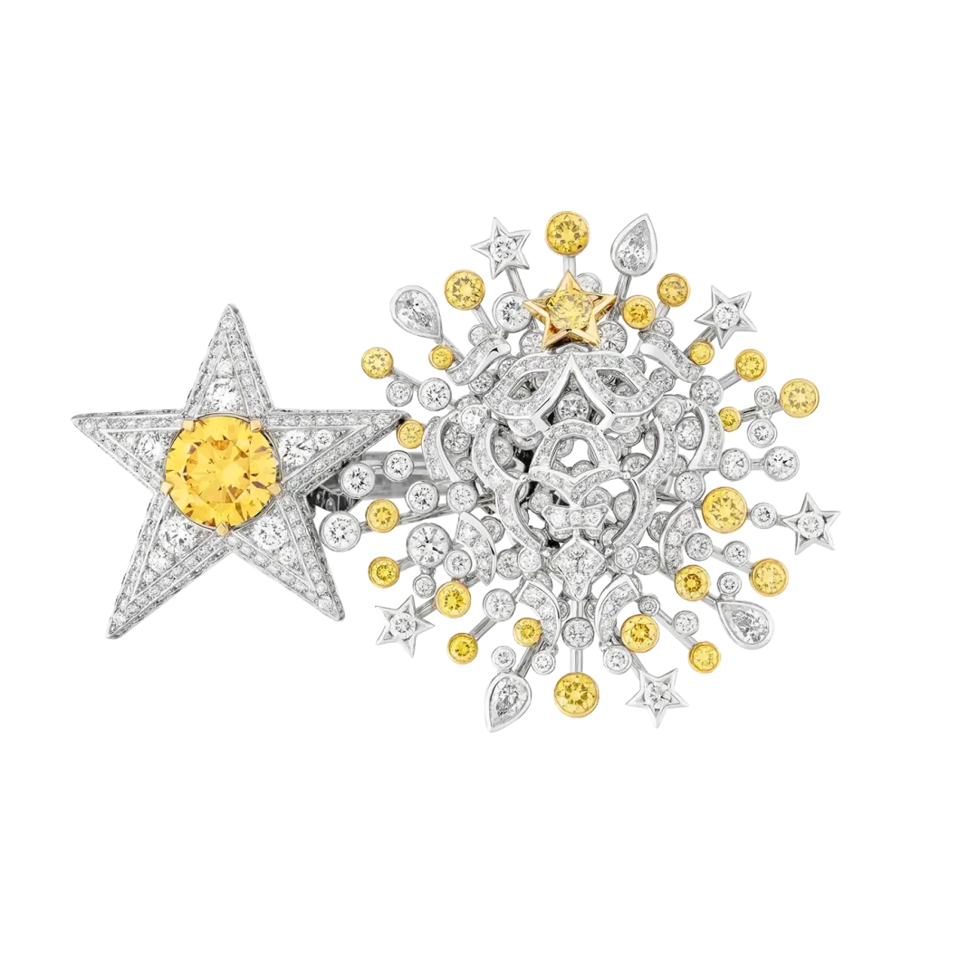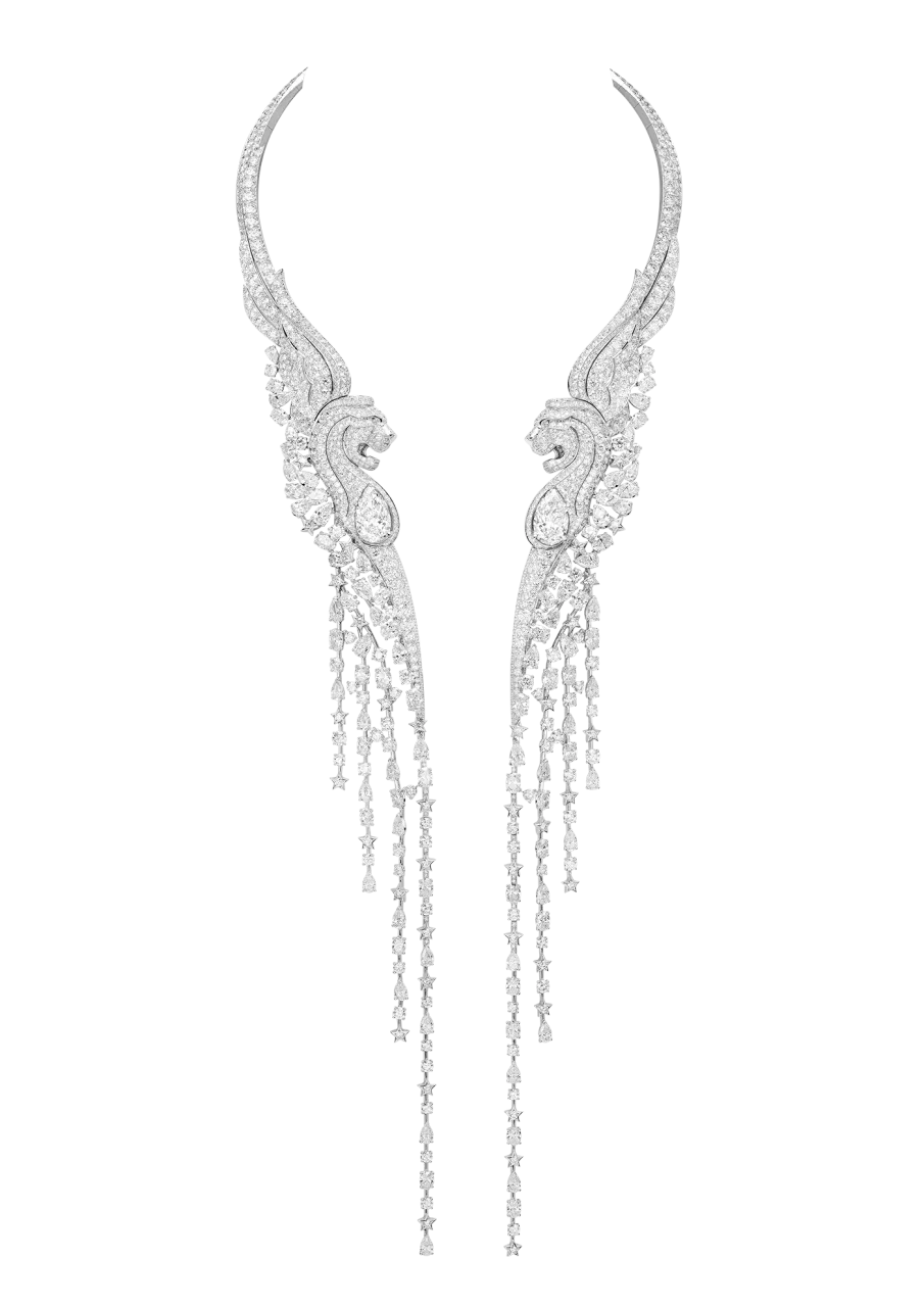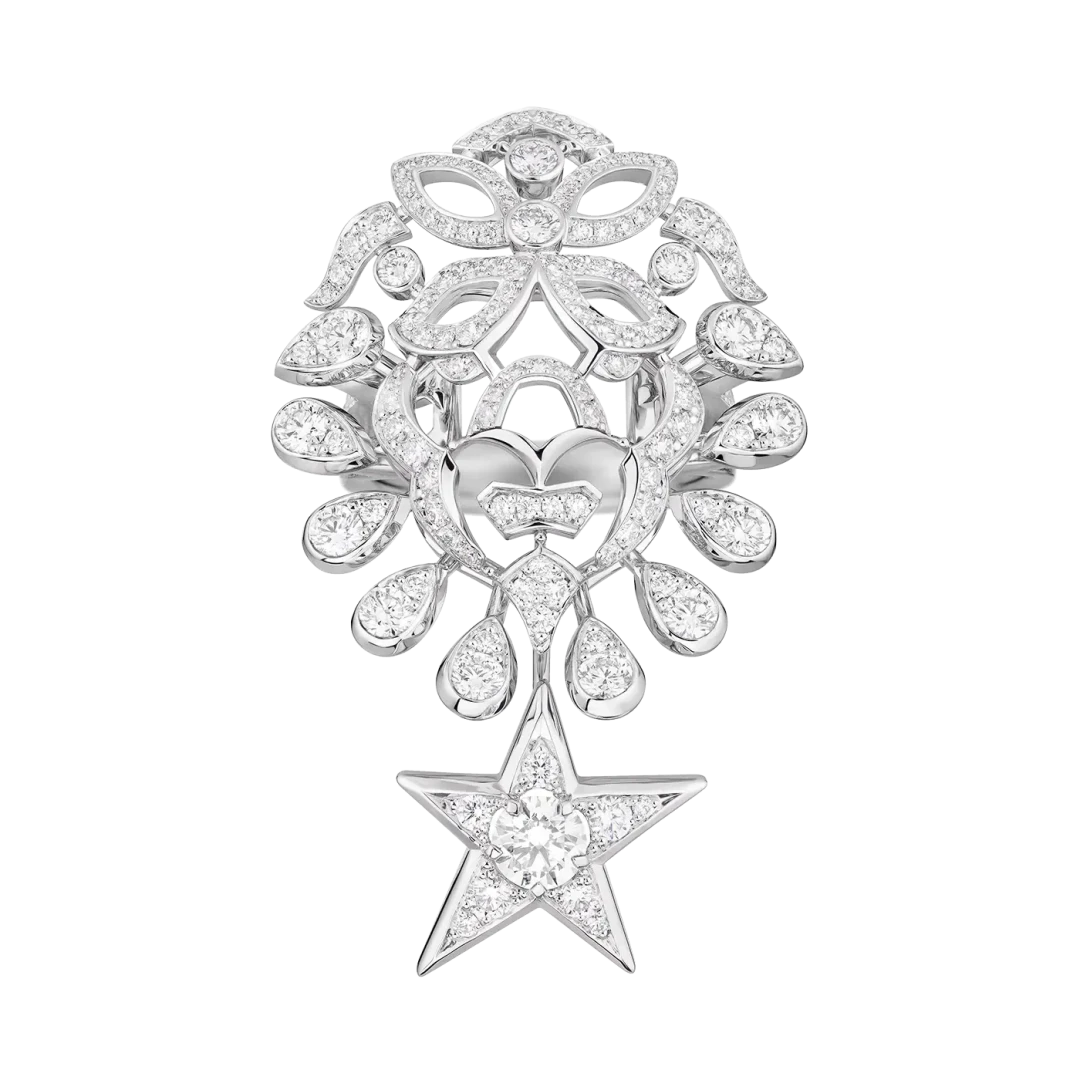 Астрологический знак Габриэль Шанель, конечно же, не мог не стать символом Chanel. Лев символизирует и силу, и элегантность. Царь зверей в коллекции Reach for the stars представлен сразу в двух интерпретациях: в профиль и анфас. Величественное животное появилось на эффектных колье, кольцах и моносерьгах в окружении бриллиантов, желтых сапфиров, рубинов, лунных камней и гранатов.