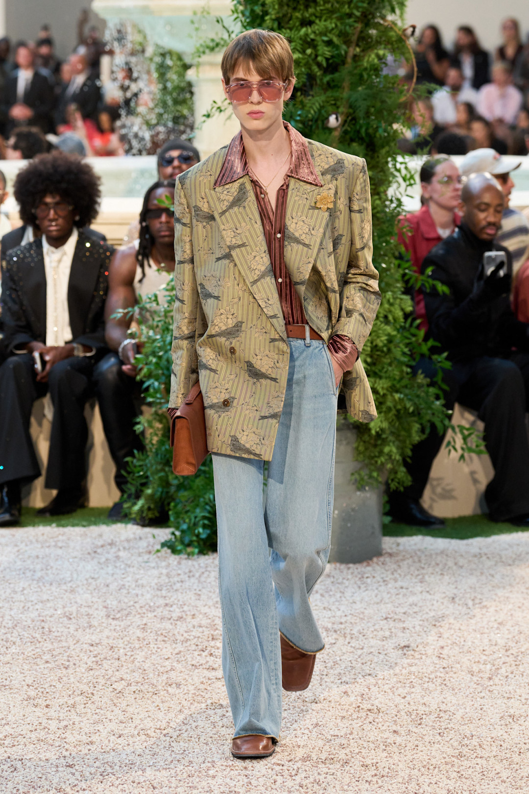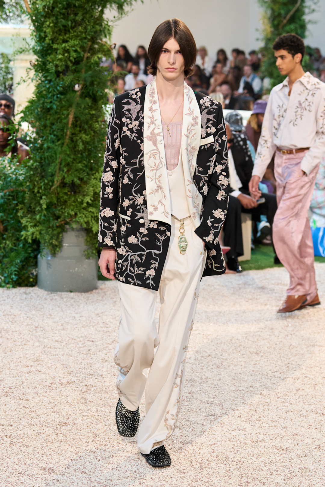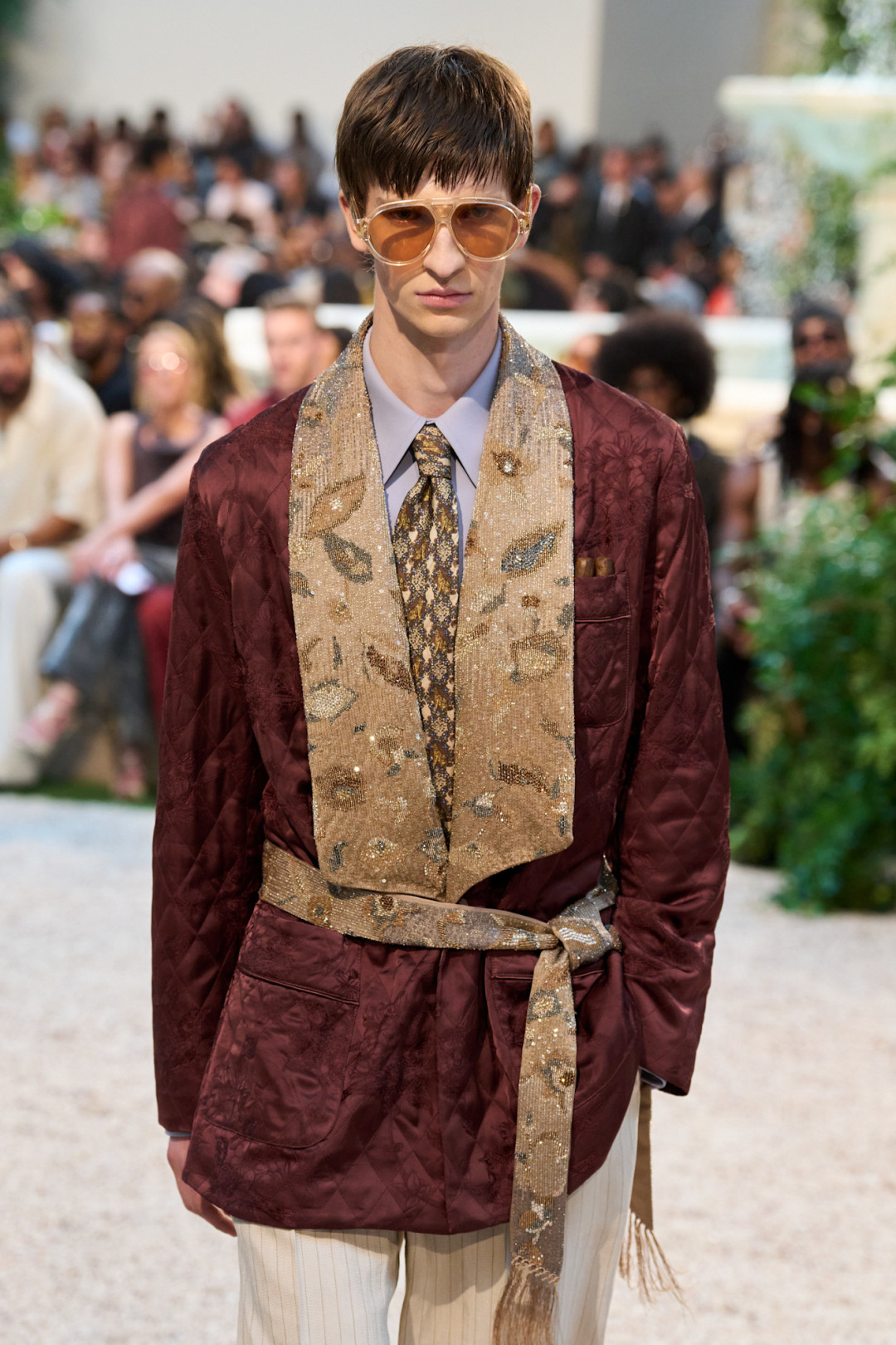 Если бы свой культовый фильм «Джентльмены» Гай Ричи снимал, предположим, в 70-е, то он мог предпочесть сдержанной классике что-то более экстравагантное. Отличный пример мы увидели у Amiri. Мужчины и женщины на шоу носили традиционные костюмы, «тройки» и шелковые пиджаки, которые очень далеки от понятия «скука». Они — элегантные и замысловатые — декорированы различными узорами и принтами: от горошка и аргайла до мотивов фауны и цветочных паттернов, которые напоминают обои в Версале. А кружевные куртки, шелковые блузы с острыми воротниками и халаты в стиле Хью Хефнера с выразительными лацканами придали коллекции винтажный шарм.