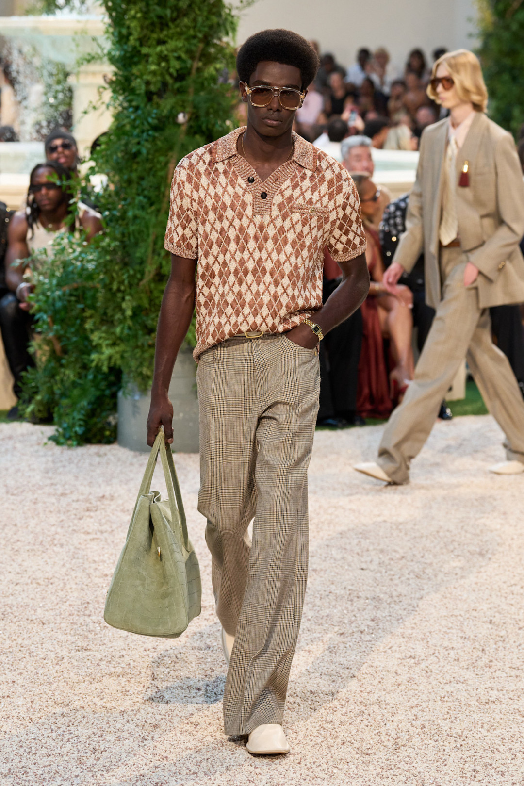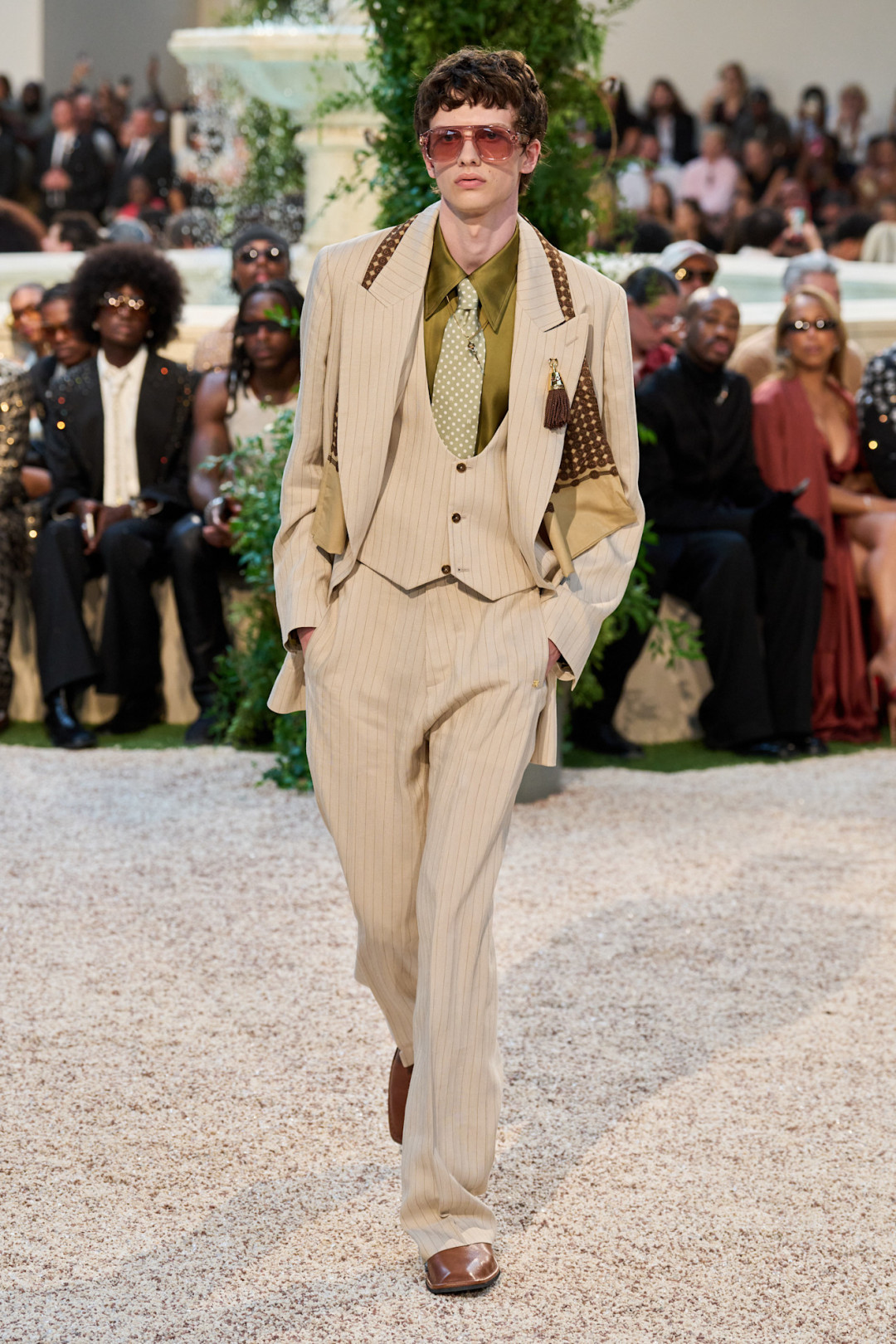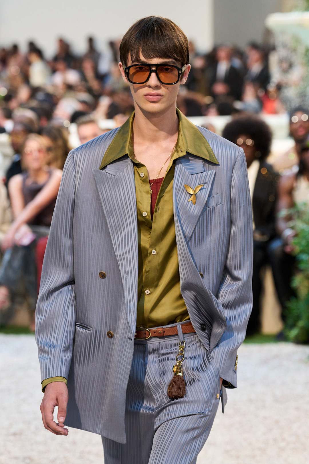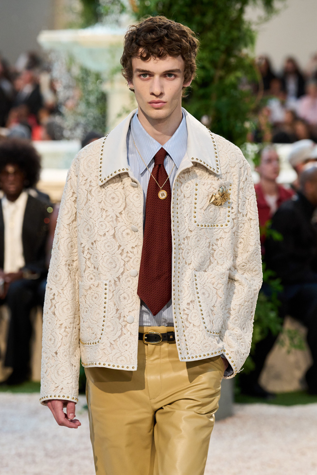 Если бы свой культовый фильм «Джентльмены» Гай Ричи снимал, предположим, в 70-е, то он мог предпочесть сдержанной классике что-то более экстравагантное. Отличный пример мы увидели у Amiri. Мужчины и женщины на шоу носили традиционные костюмы, «тройки» и шелковые пиджаки, которые очень далеки от понятия «скука». Они — элегантные и замысловатые — декорированы различными узорами и принтами: от горошка и аргайла до мотивов фауны и цветочных паттернов, которые напоминают обои в Версале. А кружевные куртки, шелковые блузы с острыми воротниками и халаты в стиле Хью Хефнера с выразительными лацканами придали коллекции винтажный шарм.