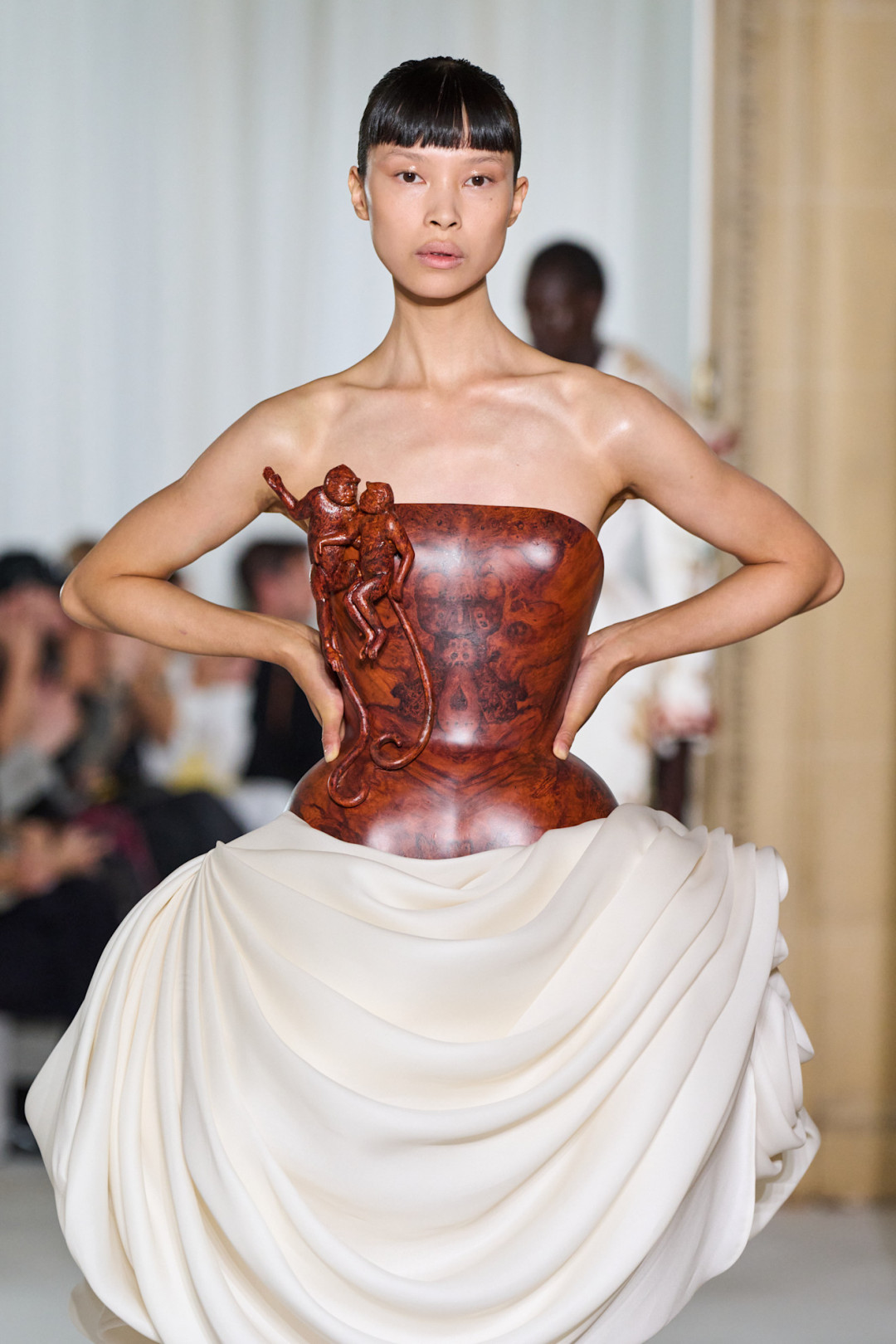 Еще один хороший пример Ashi Studio показали на текущей Неделе высокой моды. Деревянный топ (возможно, это, конечно, иллюзия обмана) с двумя обезьянами будто отсылает нас к истории Индии. Для светских выходов и повседневных образов такой элемент гардероба подойдет безупречно.
