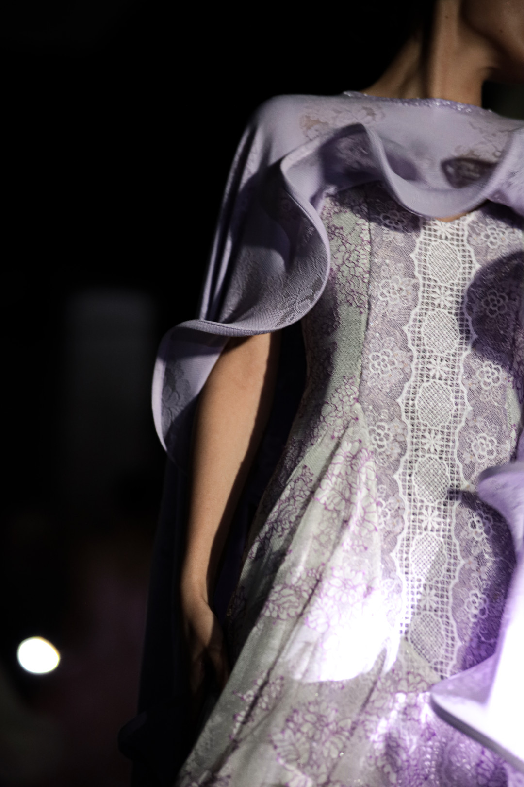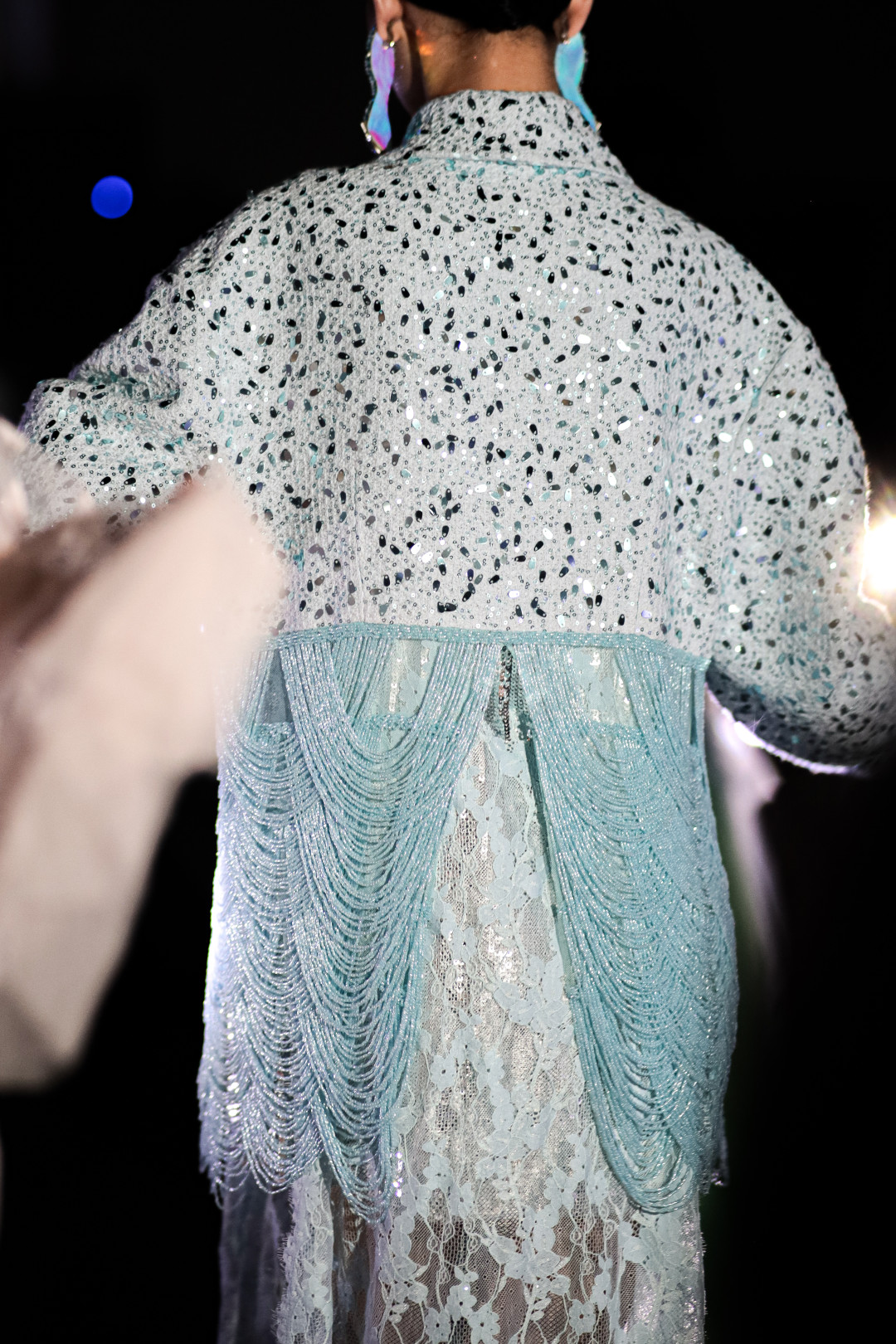 Непринужденные комбинации дополнены изобилием декора. Воланы, кружевная отделка, макраме, цветочные орнаменты и пайетки делают каждый наряд уникальным и индивидуальным. Еще одна интересная деталь, которая заслуживает отдельного внимания, — укороченные кейпы с волнистыми краями. В линии встречаются и транспарантные накидки из тонкого кружева, отлично завершающие монохромные аутфиты. Они выполнены в акварельных оттенках (ванильный, лиловый, аквамариновый) и, по задумке дизайнера, гармонично дополнят любой ваш образ.