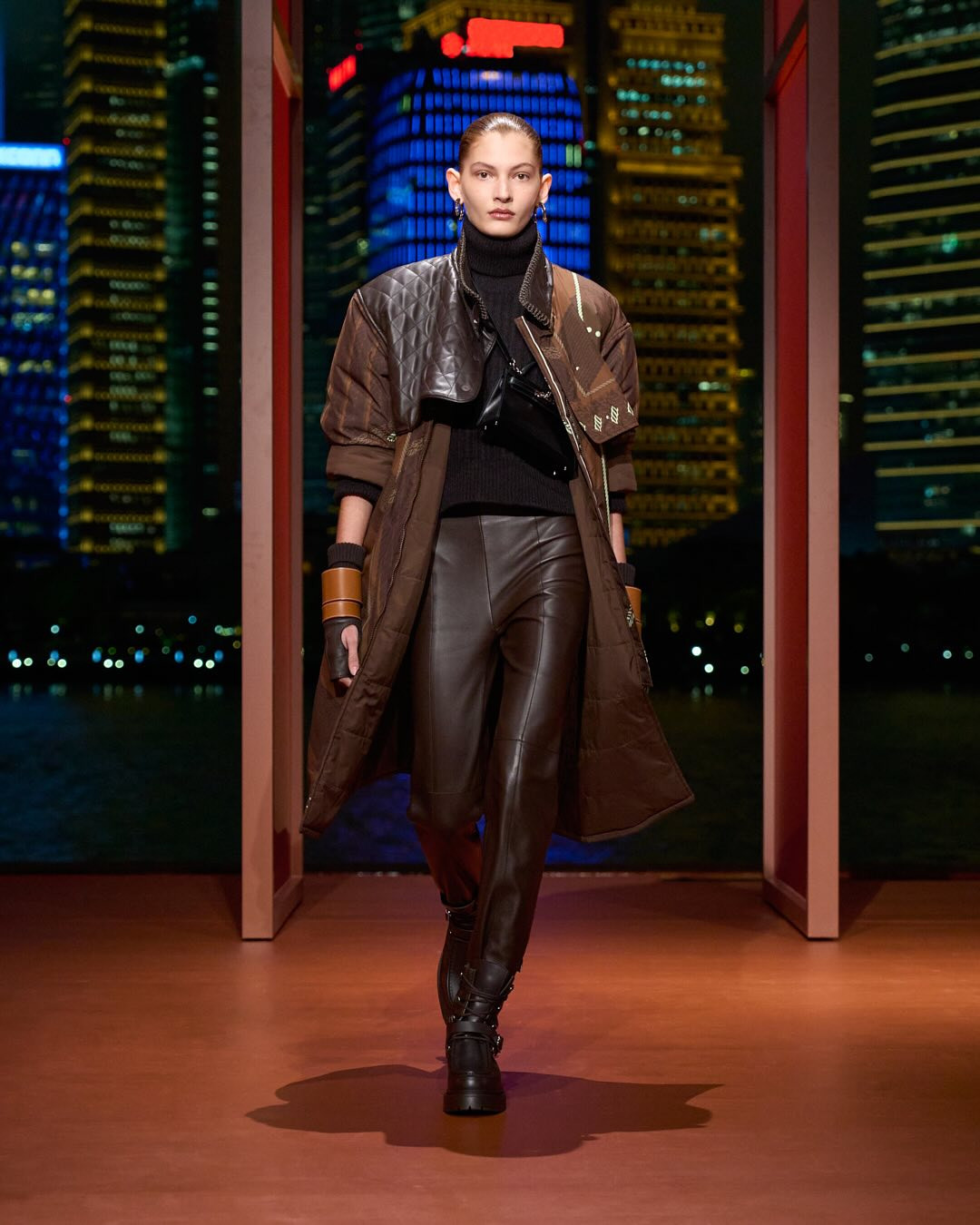 Немногословная функциональность Дома встретилась на подиуме с уличной модой. Особенно ярко это удалось передать благодаря пейзажам Шанхая, которые яркими огнями горели за спинами моделей. Надеж Ване-Цыбульски, несмотря на всю ее любовь к лаконичности и «тихой роскоши» (может, она обходится лишь чувством глубокого уважения), никогда не делает ставку на аскетичность и скромность. Ее образы всегда сложные, продуманные, многогранные и разноплановые. Игра с текстурами, формами и пропорциями не имеет границ в воображении модельера, поэтому и наряды каждый раз удивляют новизной. И этот раз не стал исключительным. Нетривиальное сочетание материалов, к примеру, глянцевой кожи, замши и плотного трикотажа, художественный руководитель ставит в приоритет. За счет этого получается многофункциональная коллекция, где каждый образ может быть переиначен в зависимости от ситуации и вашего настроения.