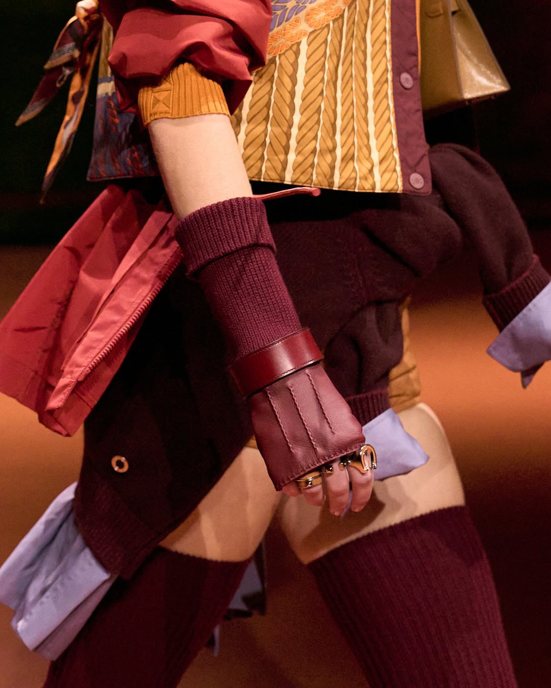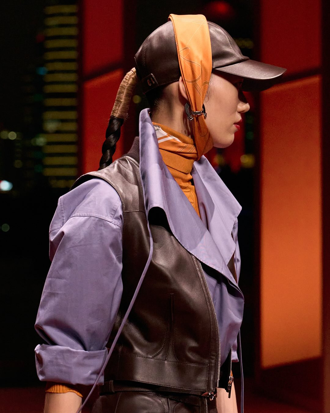 Первую часть дропа можно смело назвать мрачной и драматичной. Ване-Цыбульски слишком хорошо знает ДНК бренда, чтобы его перекраивать. Тем не менее для новой составляющей линии она сделала исключение. В основе лежат все те же монохромные, но не однообразные оттенки — сапфировый, алебастровый, охровый, вишневый и апельсиновый. Но теперь палитры активнее смешиваются между собой, рождая красивые и эффектные сочетания. Негласный главный герой коллекции — фиалковый — начинает свою игру, просачиваясь от манжетов курток рабочего до рубашек и джемперов. Он очень гармонично уживается с яркими пятнами алого, бетонного и морковного цветов. Такой фьюжн помогает сделать акцент на непривычных для Hermès паттернах, которые украсили пуховики, шелковые платки и ватники.