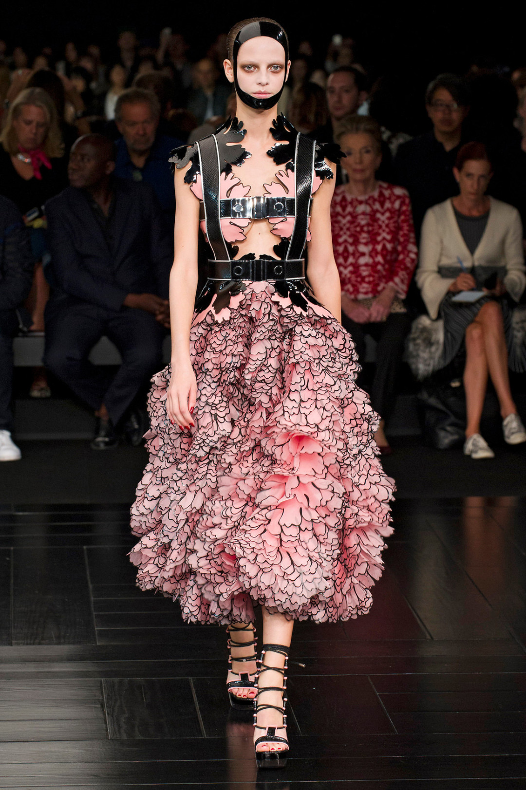 Смелая, бунтарская эстетика всегда была частью Alexander McQueen и при Саре Бертон. Она показывала, как женственность обретает формы маскулинности, а также доказывала, что современные принцессы могут носить кожаные комбинации с кружевом в один день и розовые пачки в другой.