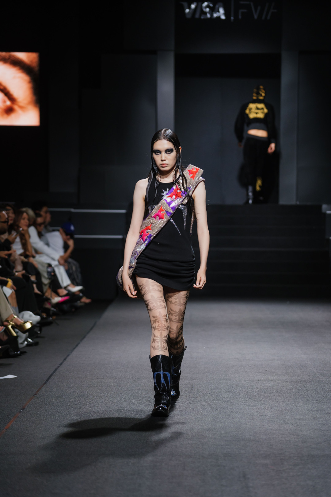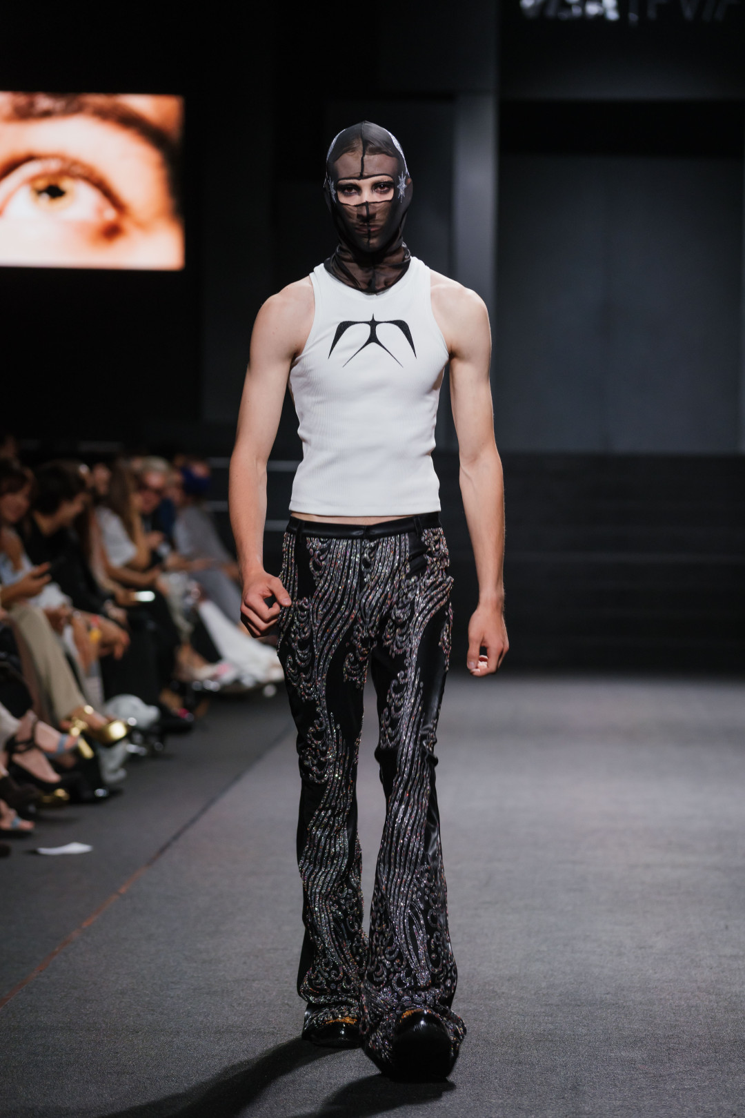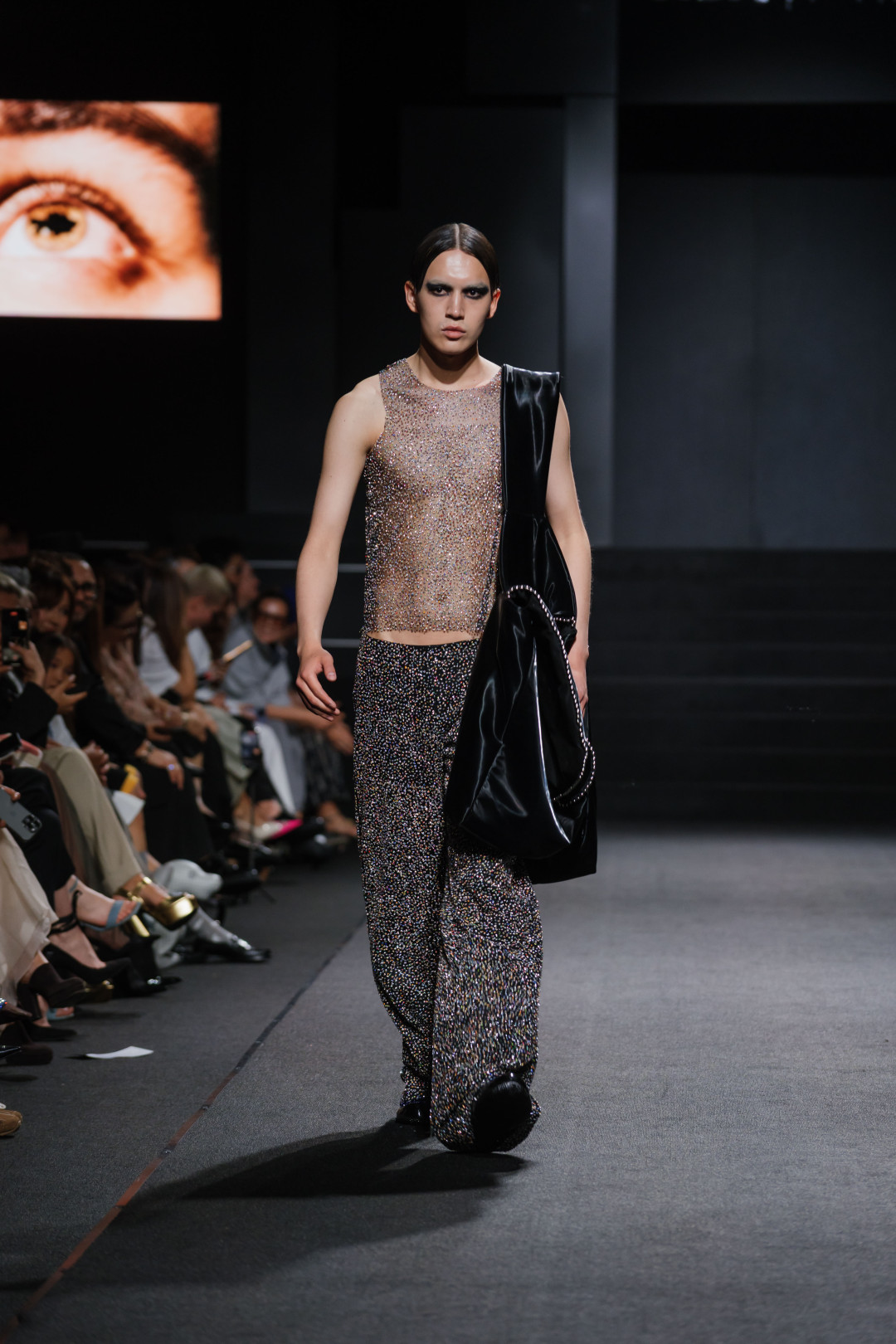 Еще одним почитателем родины стал бренд Kimmin. Но марка выбрала дерзкий гранжевый стиль, который был даже слегка агрессивным во время шоу. Команда уделила особое внимание (в очередной раз) своим корням, традициям и наследию, но пропустила их через призму смелости, воинственности и непокорности. С одной стороны линия Made In Kazakhstan обращается к локальным орнаментам, которые украшают брюки, топы и вельветовые куртки. С другой она показывает, что идентичность может быть какой угодно, главное, чтобы она отражала внутреннее свечение. Даже если все это могут выделить балаклавы, кружево, рваные силуэты и транспарантность.