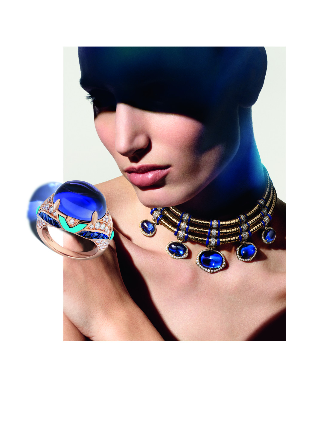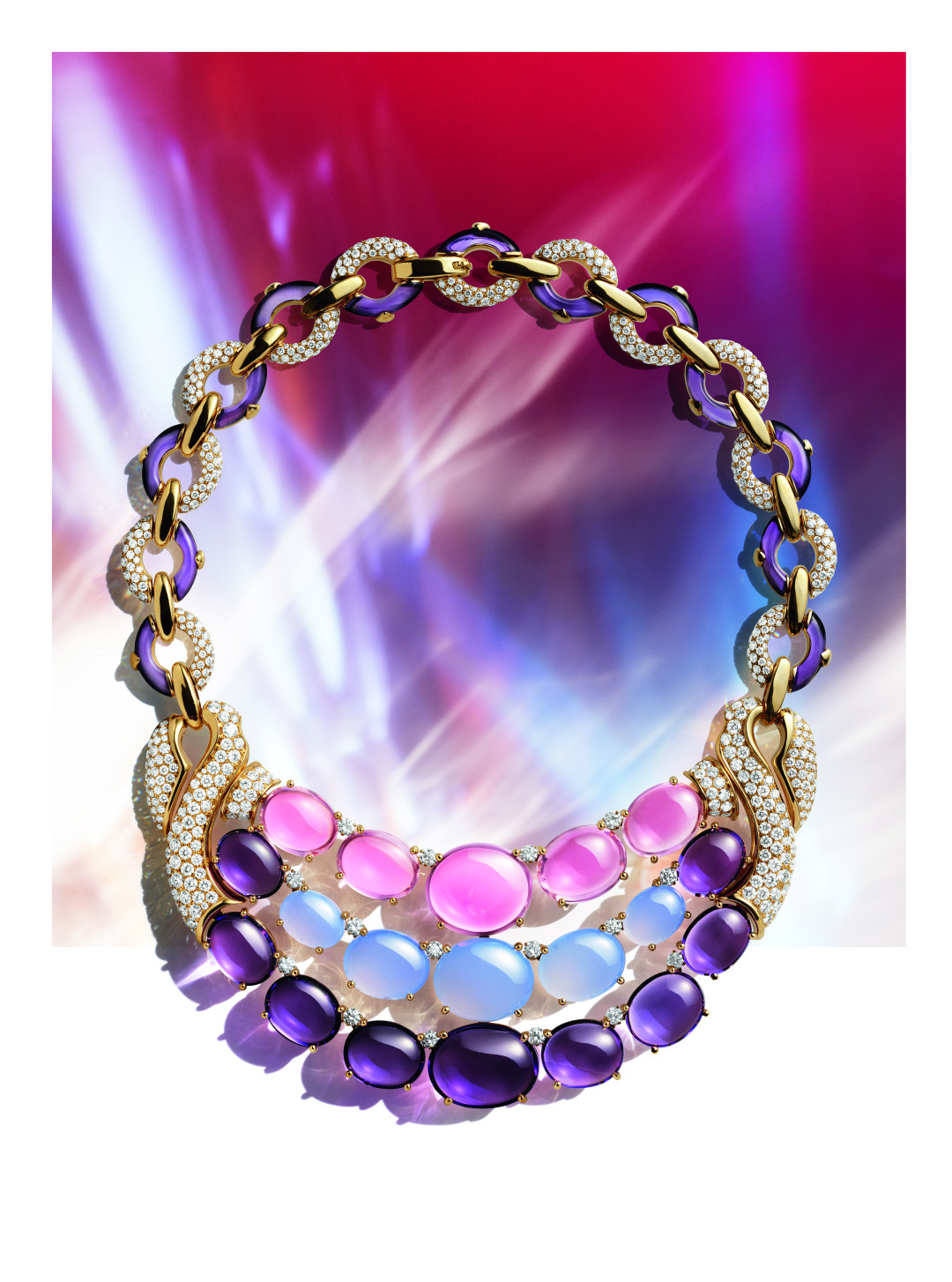 Главное, что поражает в Polychroma — это то, как Bvlgari удалось соединить культуру разных эпох, континентов и настроений в ювелирных шедеврах. Это можно почувствовать, глядя на колье Cosmic Vault, вдохновленное архитектурой Рима и астрономической красотой ночного неба. В центре расположен синий сапфир весом 123,35 карат из Шри-Ланки, который окружают более 300 камней. Все они выстроены с филигранной точностью и создают ощущение движения.