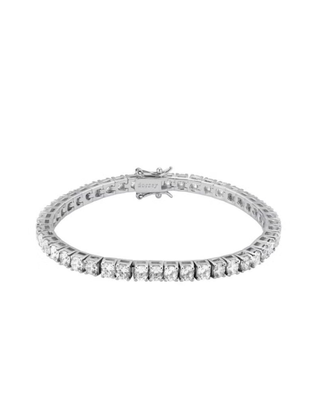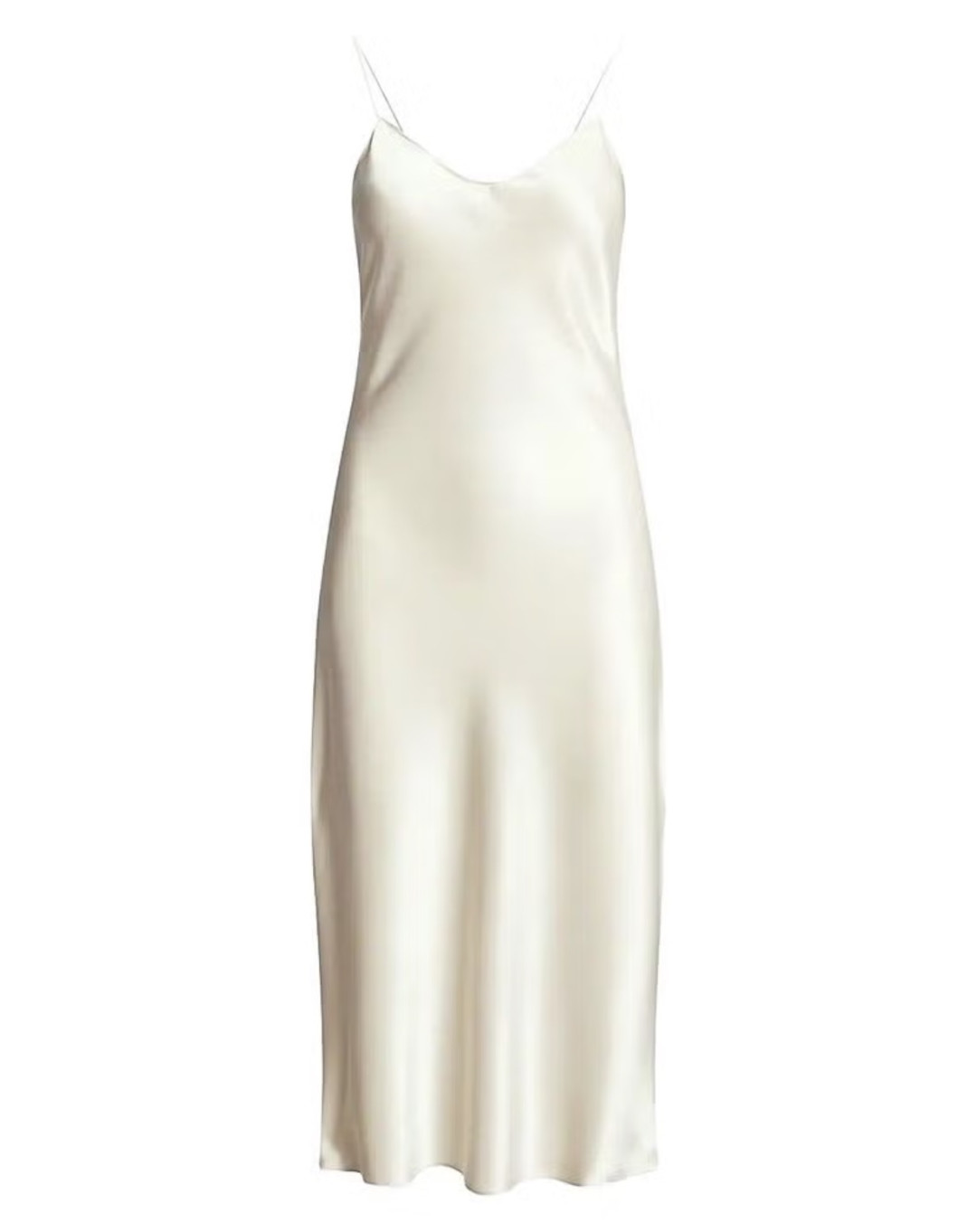 Практически все образы в теннисном стиле строятся по одному принципу: молочное платье миди, немногословная обувь и интересная сумка. Драгоценности и часы тоже должны быть минималистичными: браслет с белыми сапфирами и стальной хронометр — отличный выбор.