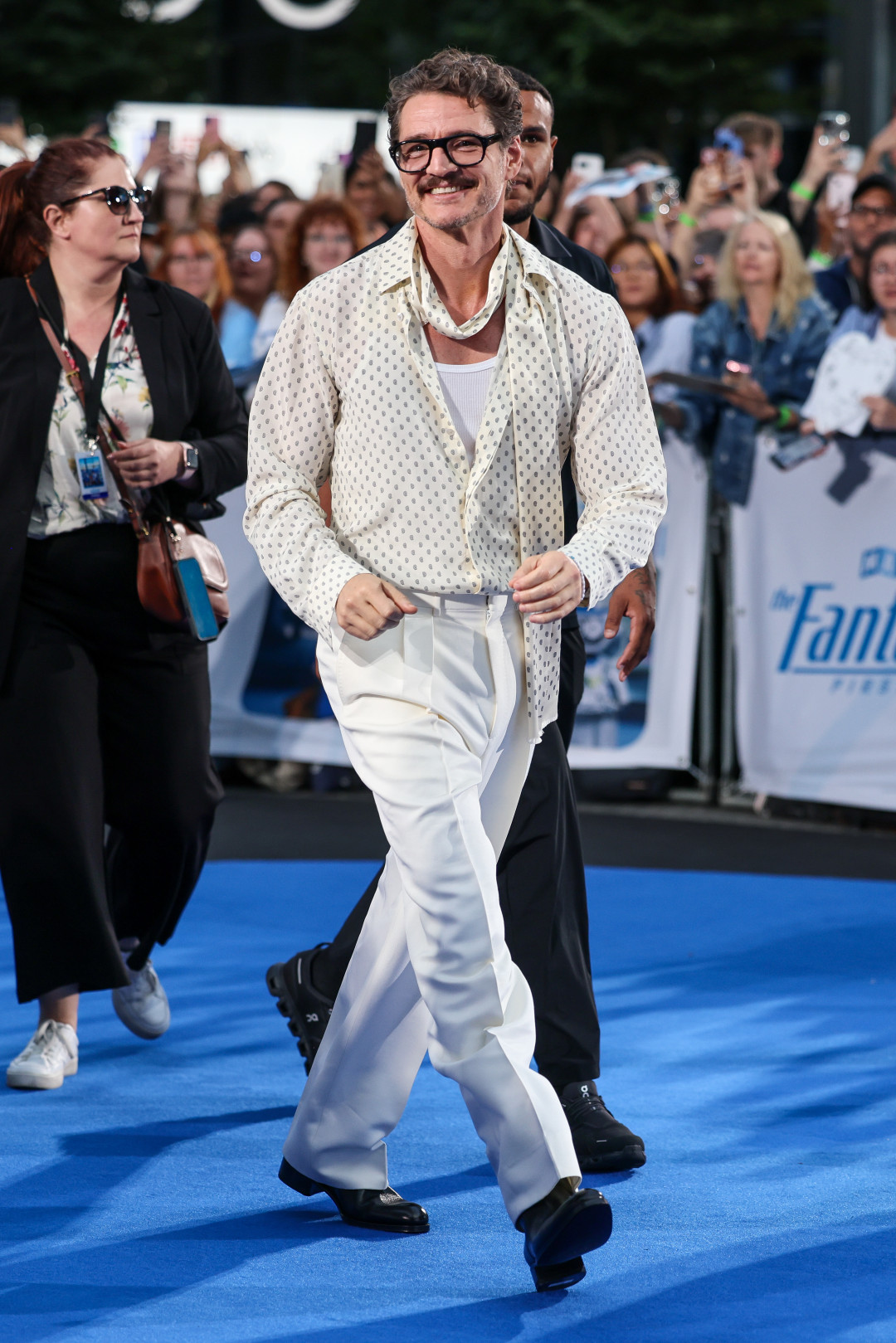 Молочные прямые брюки Педро надел с легкой, струящейся блузой в горошек. Но изюминкой образа Tom Ford все же стал незатейливый тонкий шарф. Кстати, если присмотреться, то принт, скорее, напоминает капли или ракушки, а не классическую polka dot. Из дополнительных украшений актер выбрал свои фирменные очки в черной оправе и обольстительную улыбку.