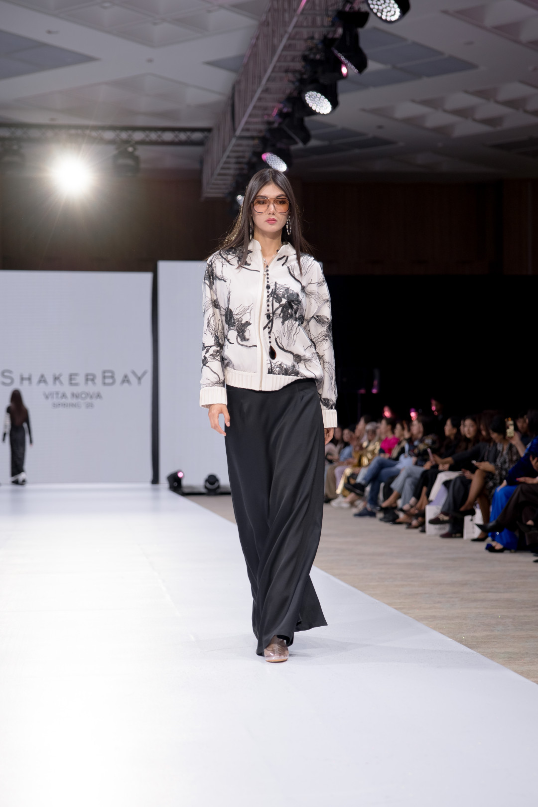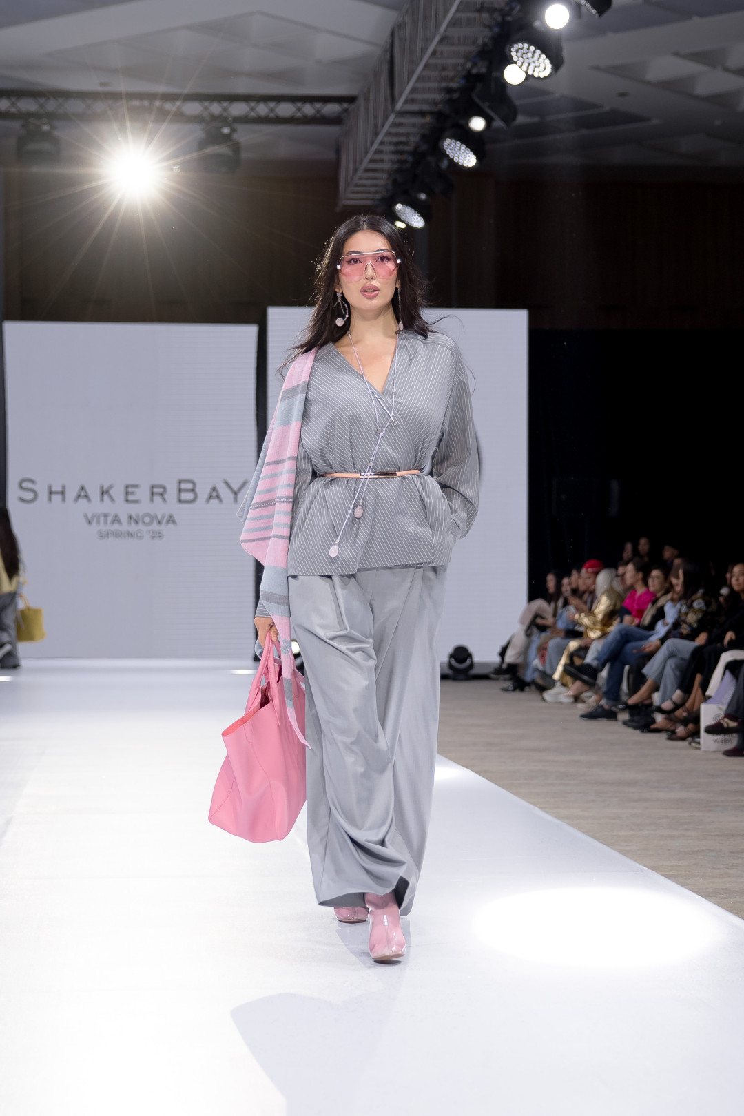 Мира Шакербай представляет свою героиню так: это успешная и независимая женщина, которая умеет совмещать карьеру, личную жизнь и отдых. Поэтому она всегда знает, какой выбор сделать. Команда бренда вновь показывает, что не стоит бояться экспериментов. Лаконичные и прагматичные брюки, блузы, свободные комбинезоны и прямые платья стали отличной базой для творческих интерпретаций ShakerBay. С помощью чапанов с принтами, длинных сотуаров и шерстяных платков в полоску образы оживают и становятся индивидуальными.