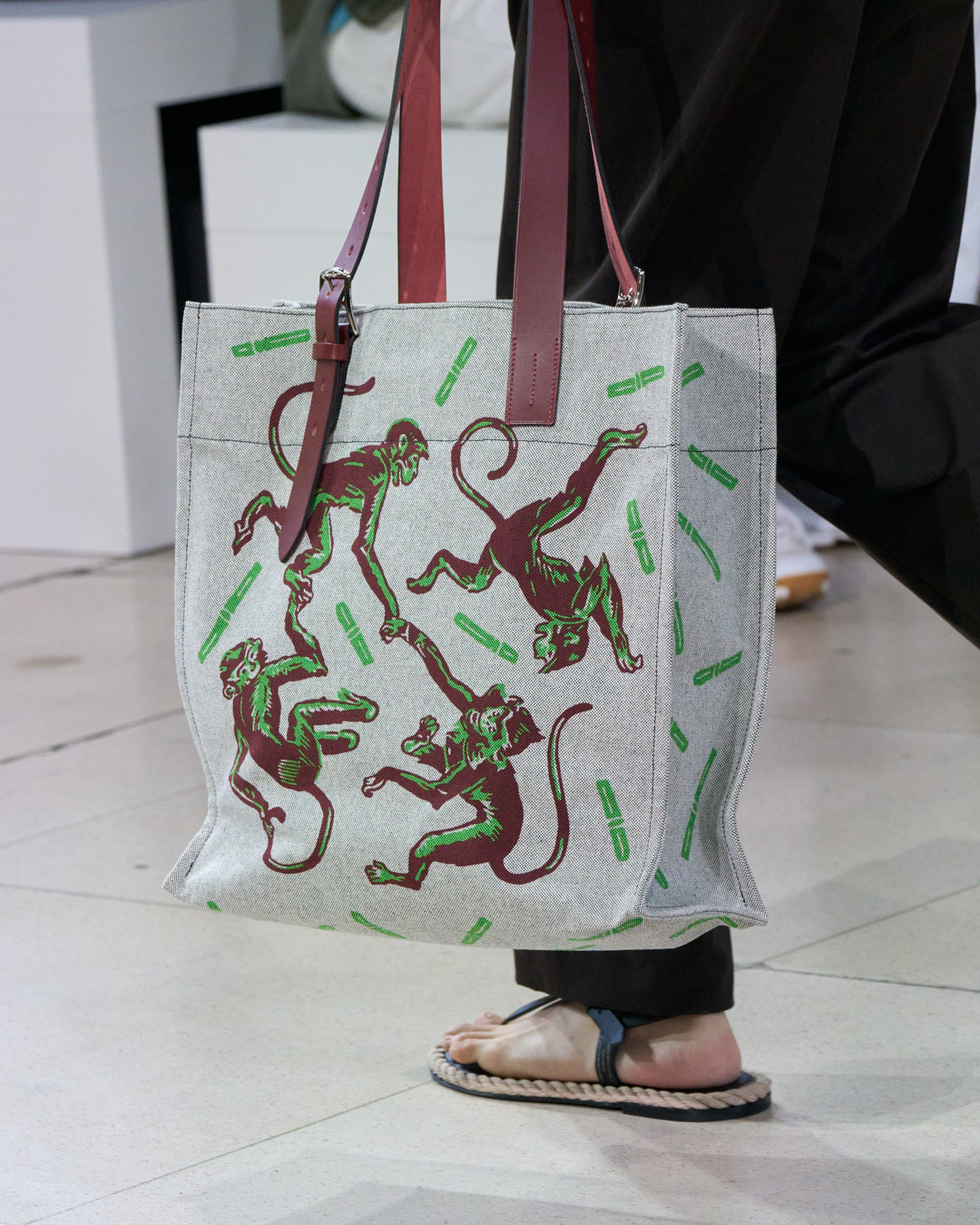 Особое внимание — аксессуарам. Сандалии с прорезями, вьетнамки с канатной отделкой, и, конечно, сумки: объемные, глубокие, из холста и кожи, или украшенные принтами с жокеями и танцующими обезьянами.