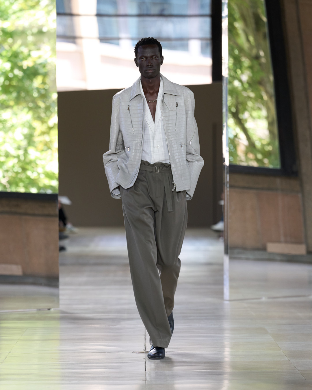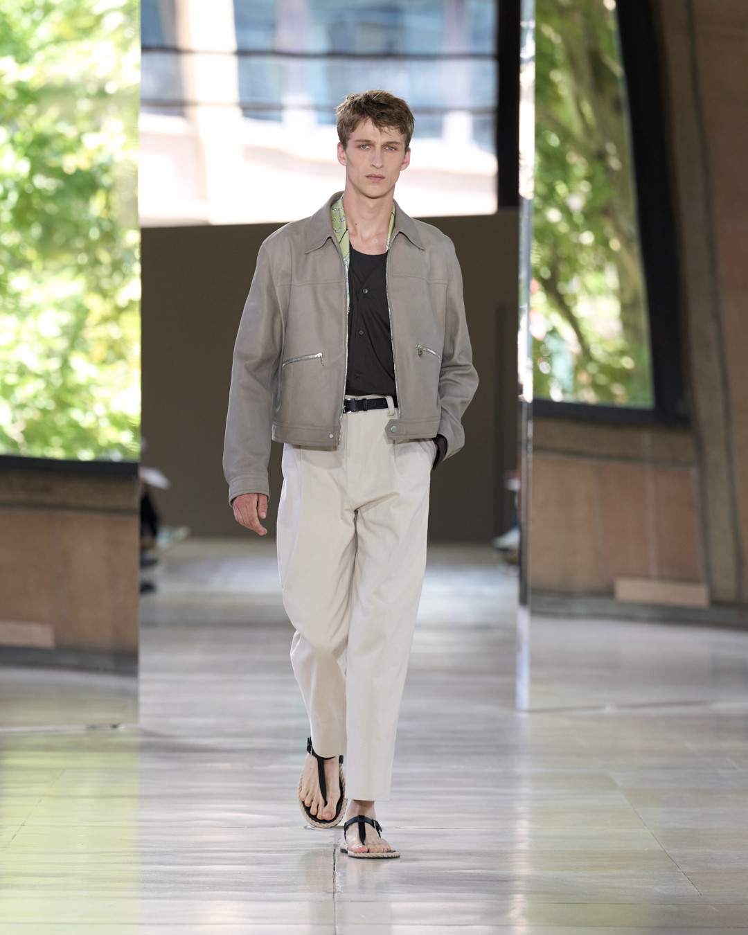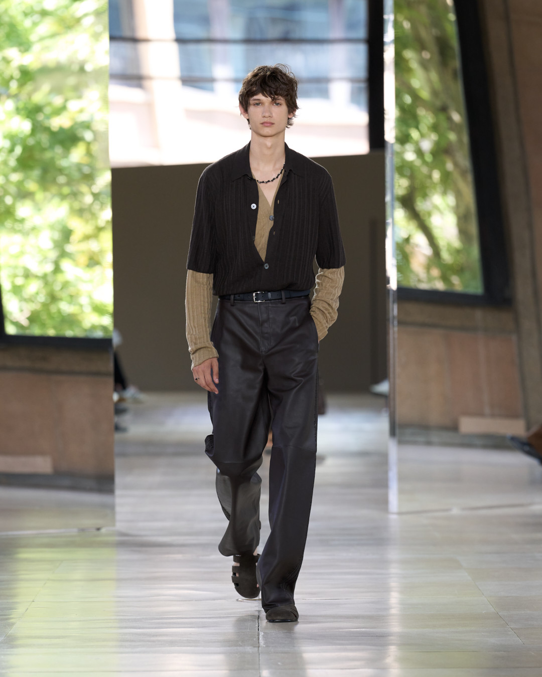 После прошлогоднего триумфа коротких шорт в этом сезоне Нишанян резко изменила курс и отказалась от них вовсе — вопреки всеобщей одержимости этой вещью в мужских коллекциях. Она вернулась к своей излюбленной спокойной палитре: оттенки шпаклевки, выбеленного дерева, ванили, пыли и кофе — и снова доказала: простота, выполненная из идеальных тканей и с ювелирной точностью, — и есть настоящее мастерство. Сегодня в мире мужской моды трудно найти более точное воплощение сдержанной элегантности, чем Hermès.