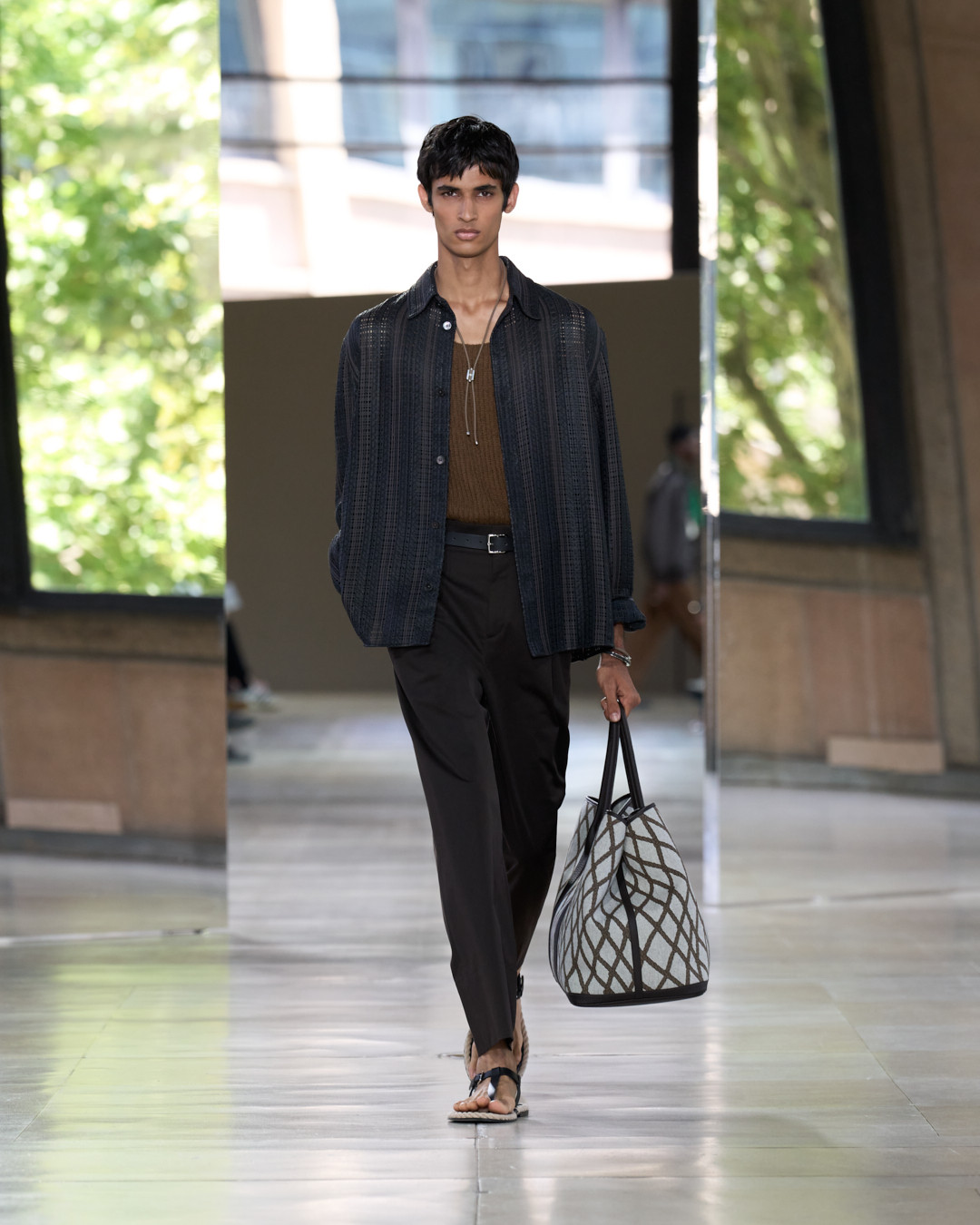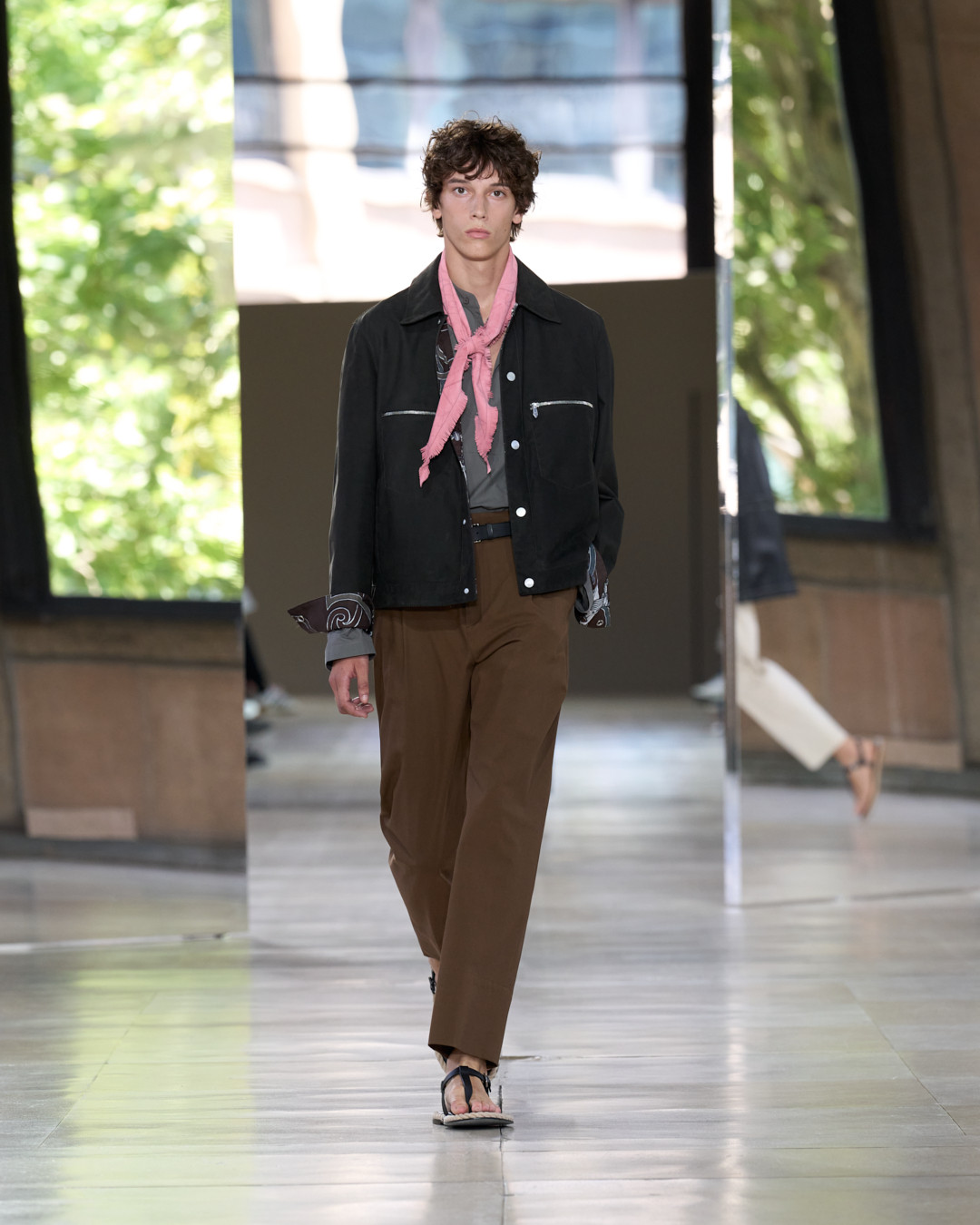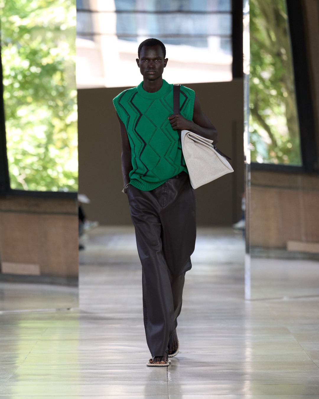 После прошлогоднего триумфа коротких шорт в этом сезоне Нишанян резко изменила курс и отказалась от них вовсе — вопреки всеобщей одержимости этой вещью в мужских коллекциях. Она вернулась к своей излюбленной спокойной палитре: оттенки шпаклевки, выбеленного дерева, ванили, пыли и кофе — и снова доказала: простота, выполненная из идеальных тканей и с ювелирной точностью, — и есть настоящее мастерство. Сегодня в мире мужской моды трудно найти более точное воплощение сдержанной элегантности, чем Hermès.