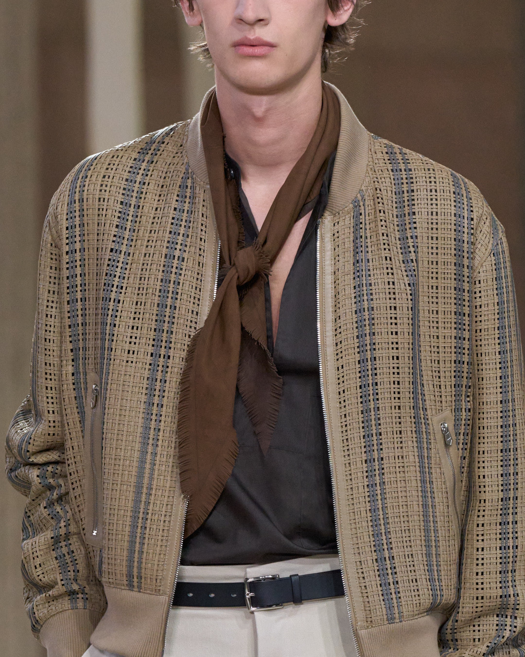 Коллекция начиналась с образов, напоминающих хирургические халаты или рубашки хенли, сшитых из мягчайшей телячьей кожи. Все они дополнялись новым аксессуаром сезона — шейным шарфом с бахромой. Галстуки остались в прошлом. Далее — многофункциональные вещи: куртки-рубашки, гибриды сафари и парки. Даже экзотическая кожа оказалась здесь не для демонстрации статуса, а ради сдержанной утилитарности — как, например, в охотничьих жилетах.
