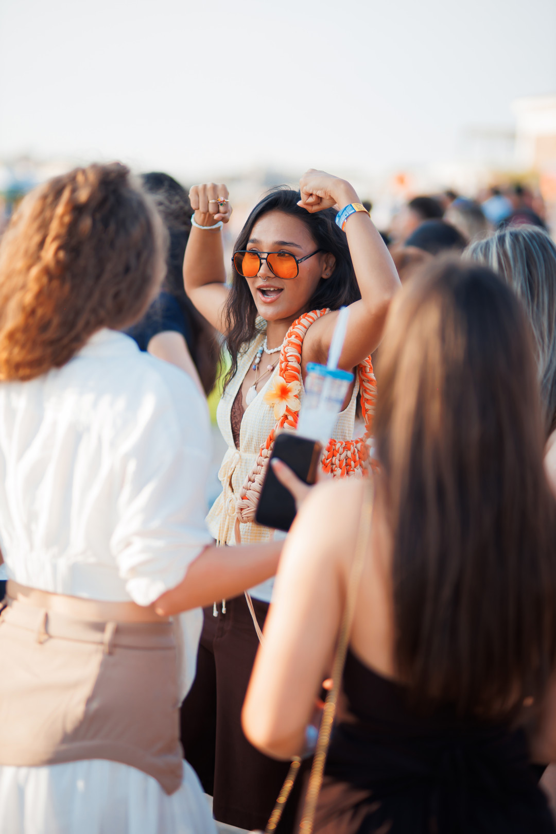Выбранная площадка — у самой кромки моря, с видом на горизонт и открытым небом над головой — задала тон всему ивенту. Песок, вечерний бриз, закатное солнце, разноцветные пледы, стильные гости и звуки музыки, доносящиеся со сцены, создавали обстановку, в которую органично вписался каждый. Здесь не было места спешке или городскому шуму — все располагало к тому, чтобы остановиться, вдохнуть воздух полной грудью и просто наслаждаться моментом.