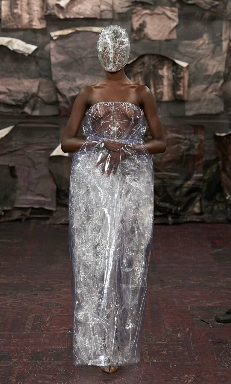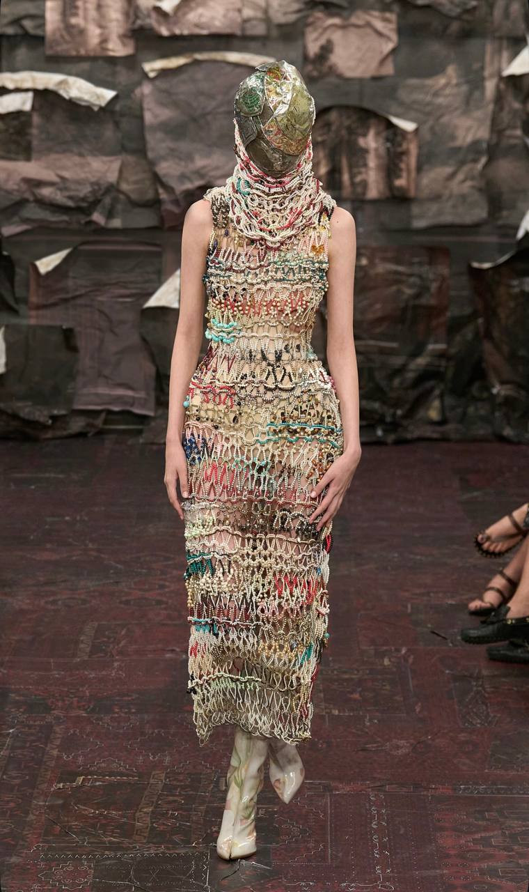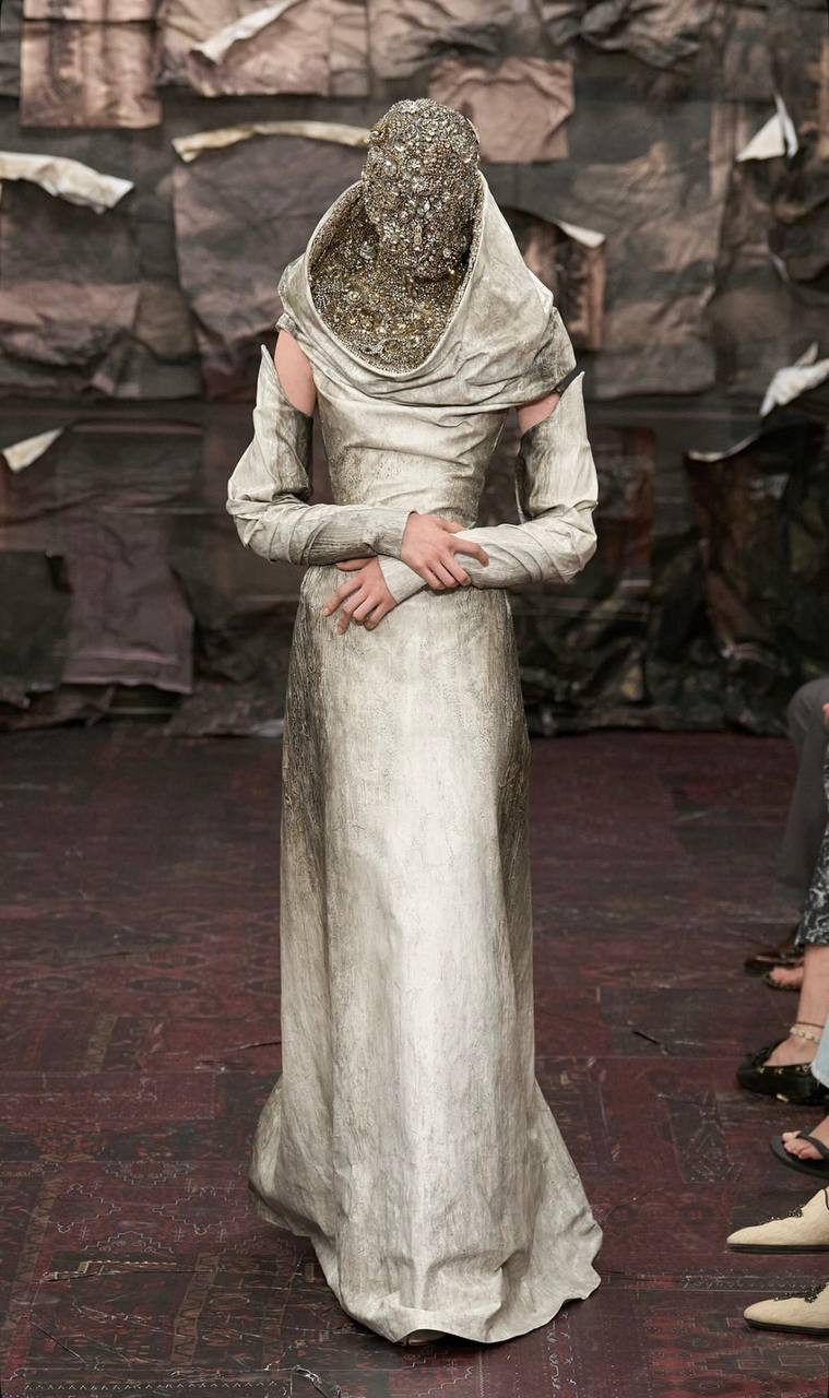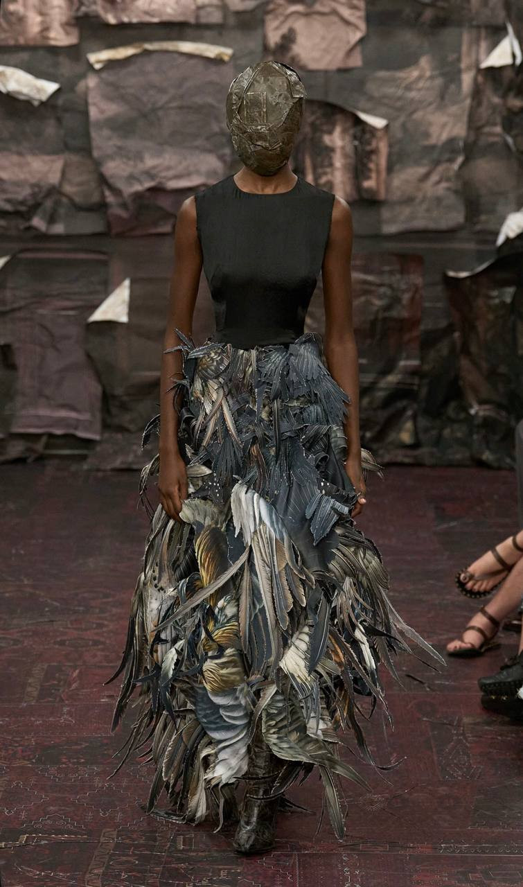 Дебютная коллекция Гленна Мартенса получилась самой драматичной на Неделе высокой моды — все в лучших традициях Дома. Спустя 18 месяц после прощального показа Джона Гальяно бренд вновь вступает в игру. На модном ринге (назовем это так) столкнулись театральные образы, вдохновленные архитектурой и атмосферой Фландрии и Нидерландов. Лица моделей намеренно закрыты, чтобы не красть внимание зрителей у пышных платьев золотистого оттенка (они точно не вылиты из драгоценного металла?), прозрачных бюстье из ПВХ и средневековых аутфитов из дюшес-атласа. Некоторые образы вполне могли бы стать текучим зеркалом из мрачного фильма «Белоснежка и охотник», а юбки, выполненные из крыльев птиц, — самые эффектные на шоу — пригодились бы ведьмам из фольклорных сказок. Ждем, когда знаменитости будут носить на ковровых дорожках сарафан из разноцветных бусин, шифоновое платье с анатомическим корсетом и пиджаки, облепленные фресками.