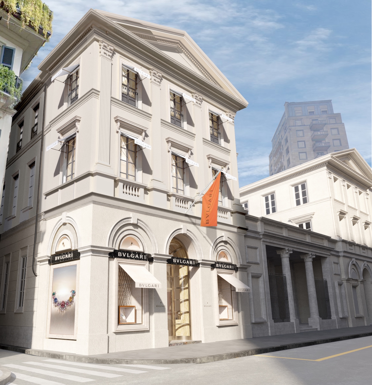 Новый бутик на Виа Монтенаполеоне разместился в историческом здании Taverna Radice Fossati, созданном выдающимся архитектором Фердинандо Альбертолли в 1835 году. Пространство, занимающее три этажа и общую площадь 750 квадратных метров, стало идеальным фоном для демонстрации продукции Bvlgari, но также само по себе является произведением искусства.