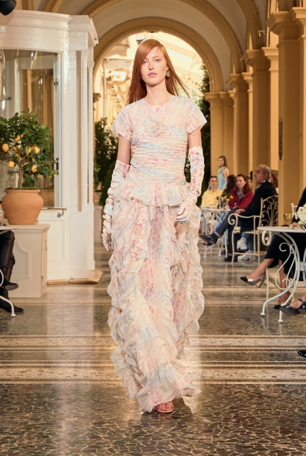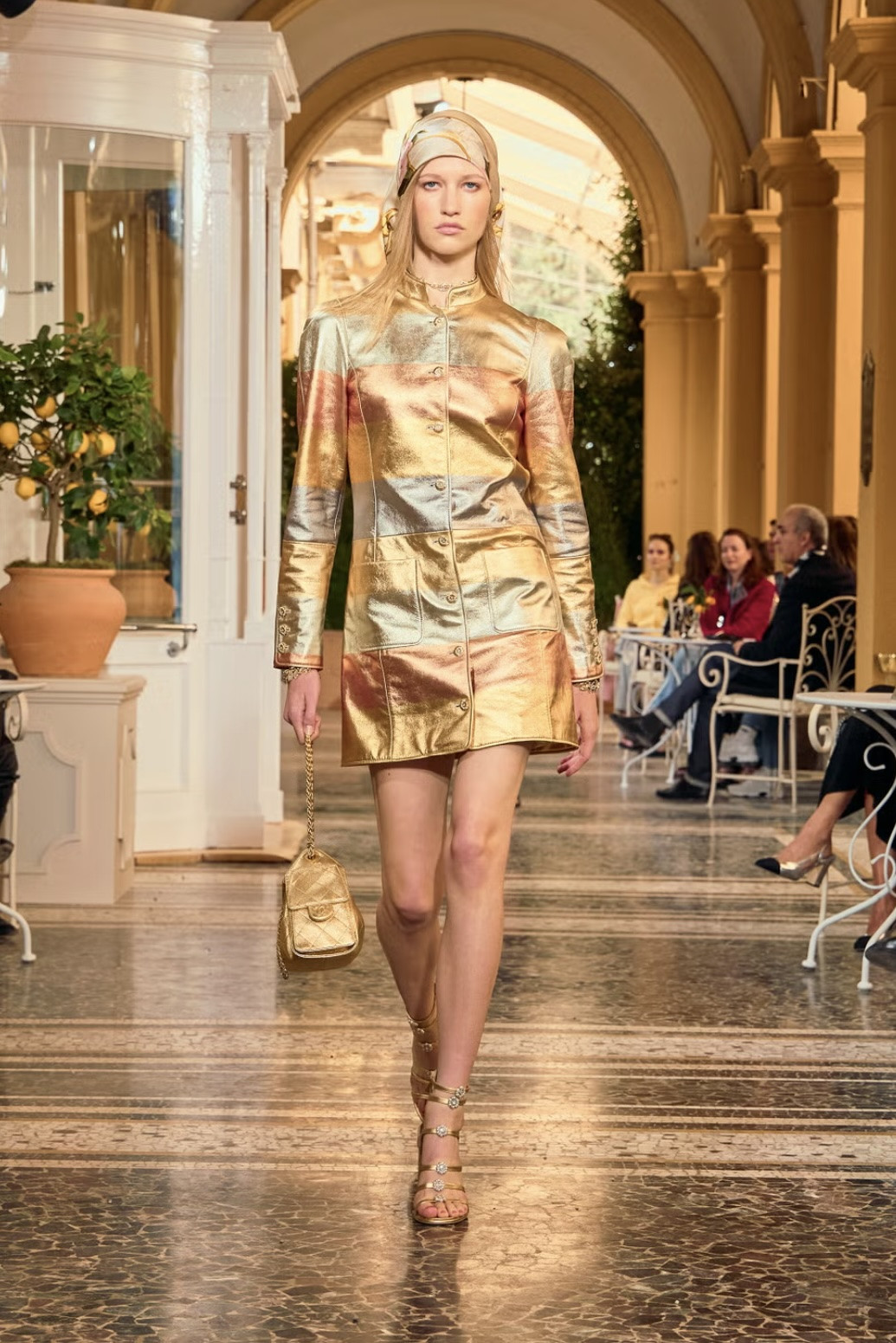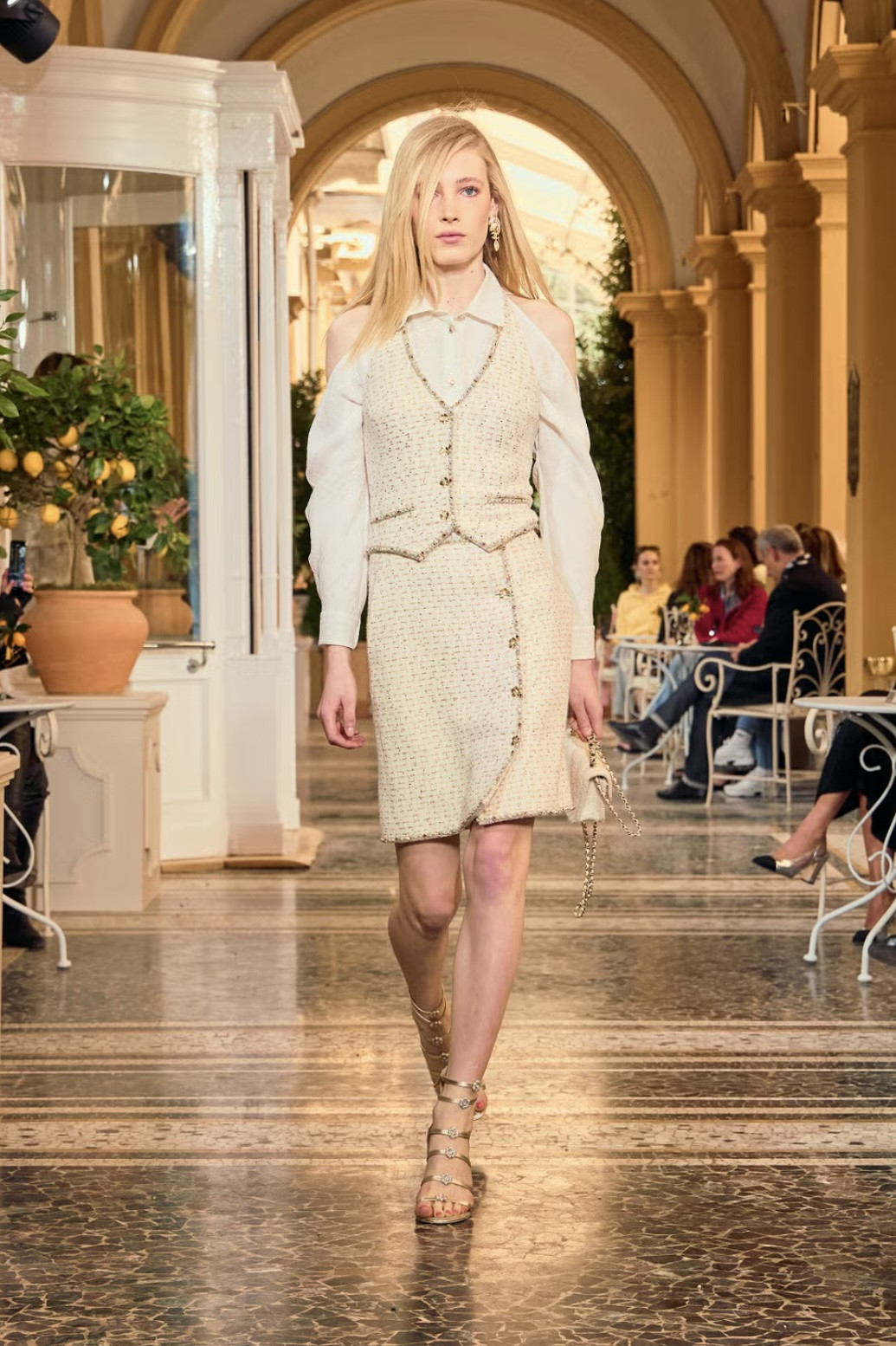 Живописные пейзажи озера Комо всегда притягивают внимание мира фэшн. Несколько лет назад Louis Vuitton продемонстрировали здесь свою круизную коллекцию. А новая линия Chanel Resort 2026 была презентована на Villa d'Este, которая известна своим итальянским садом эпохи Возрождения и виллой XVI века. Гости показа расположились за кофейными столиками по разным сторонам подиума, поэтому возникло ощущение, что они просто прохожие, которые случайно застали эффектное шоу.