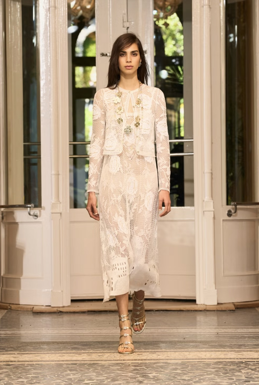 Излюбленный Домом твид «оживает» не только на костюмах, но также на жилетах с тонкими лямками, бомберах с капюшоном, юбках с завышенной талией и необычных платьях. Материал в этом сезоне считается ультрамодным, но, помимо этого, он символизирует собой вневременную элегантность. Не обошлось без кружевных и полупрозрачных аутфитов (большая редкость для линий бренда), трендовых топов с баской и нарядов, декорированных пайетками.
