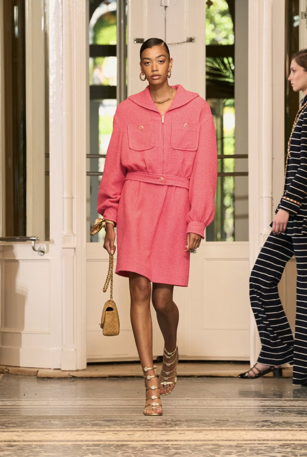 Команда хотела показать, какой разной и непредсказуемой может быть героиня Chanel. Днем она носит свободные платья, озорные купальники с длинными накидками, твидовые костюмы и вязаные транспарантные комбинации. А под покровом ночи просыпается другая сторона ее личности — дерзкая, сексуальная и откровенная. Доказательством тому служат кожаные сарафаны, комплекты а-ля Барбра Стрейзанд на «Оскаре» 1969 года и мрачные, но притягательные топы со стразами. Морская тематика тоже легким флером присутствует в коллекции Chanel Resort 2026. Без нее образы не были бы такими непринужденными и кокетливыми. К тому же Шанель и сама была без ума от полоски и ненавязчивой небрежности.