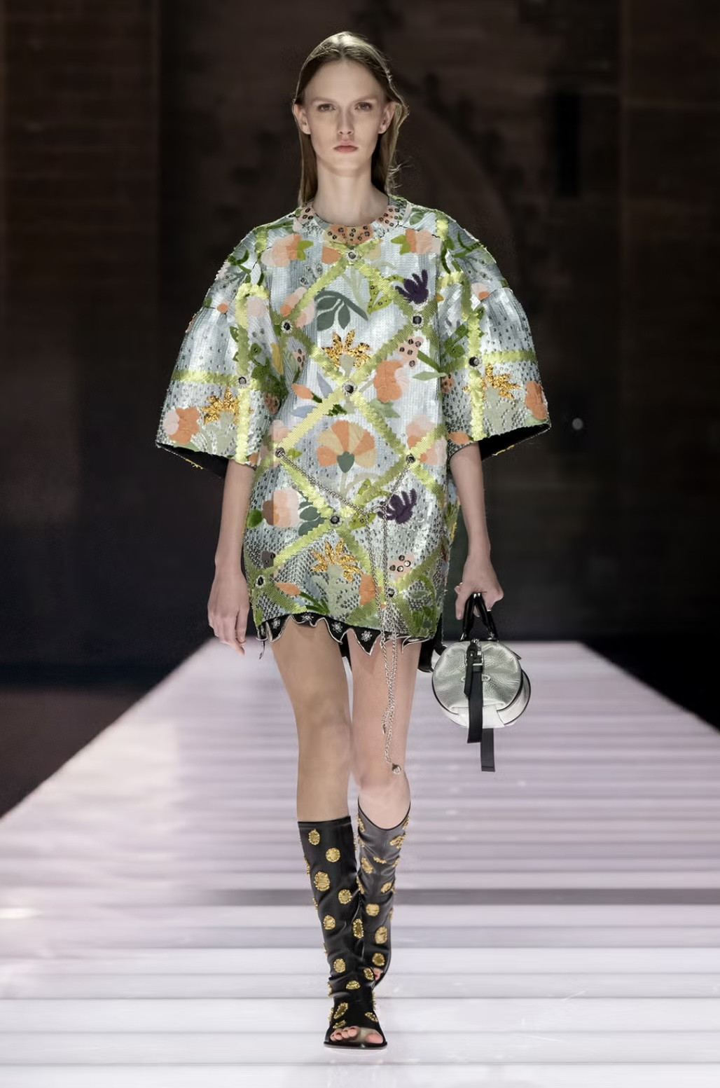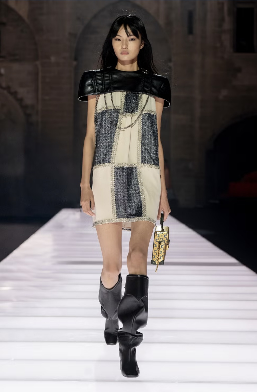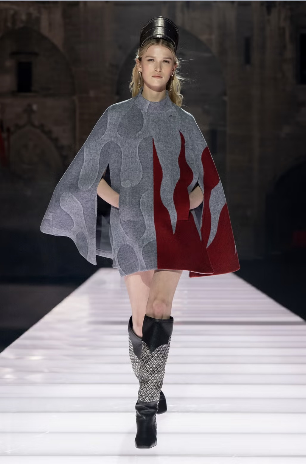 Еще один необычный ход — превратить латы и доспехи в блузы и юбки. Первые остались с незначительным металлическим переливом, но стали легкими и (что вполне логично) менее прочными. Накидки команда французского Дома теперь предлагает носить с драматичными платьями и практически все наряды дропа — с сапогами без носка, декорированными крупными кристаллами.