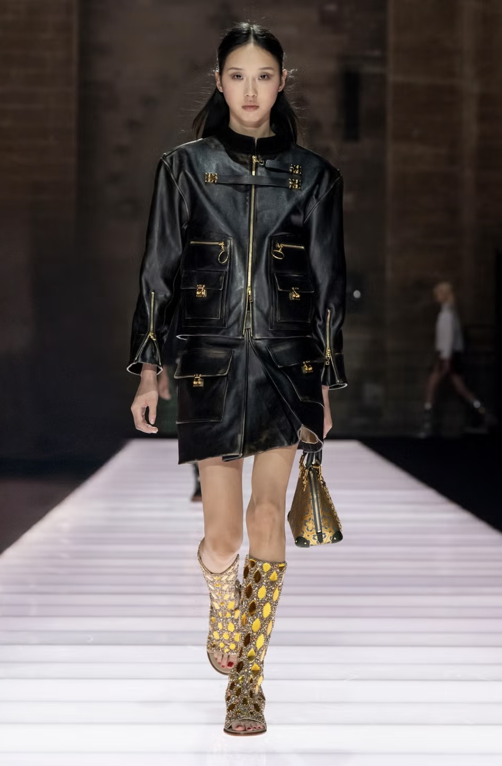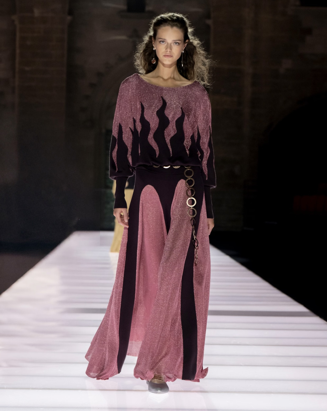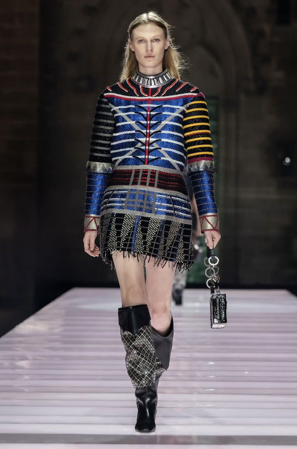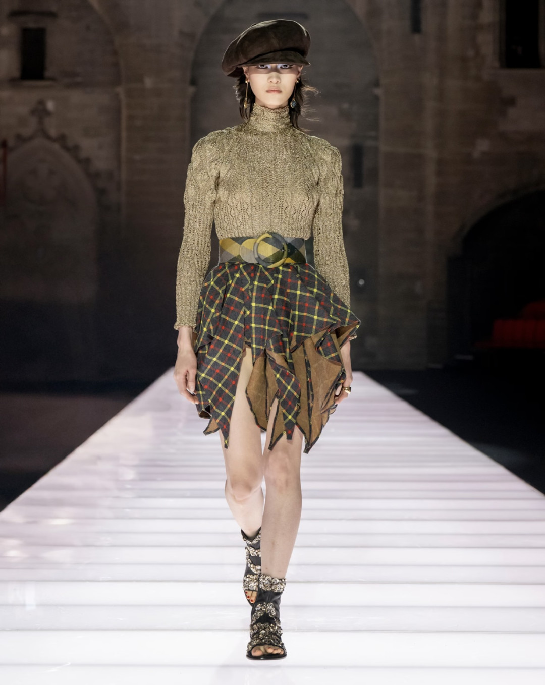 Еще один необычный ход — превратить латы и доспехи в блузы и юбки. Первые остались с незначительным металлическим переливом, но стали легкими и (что вполне логично) менее прочными. Накидки команда французского Дома теперь предлагает носить с драматичными платьями и практически все наряды дропа — с сапогами без носка, декорированными крупными кристаллами.