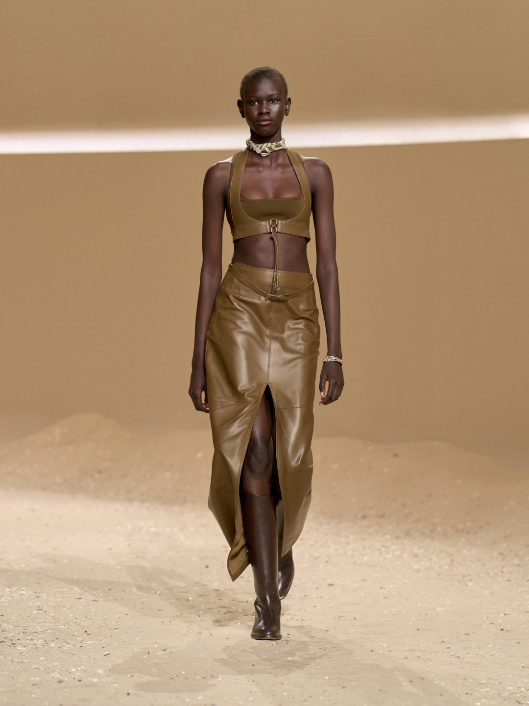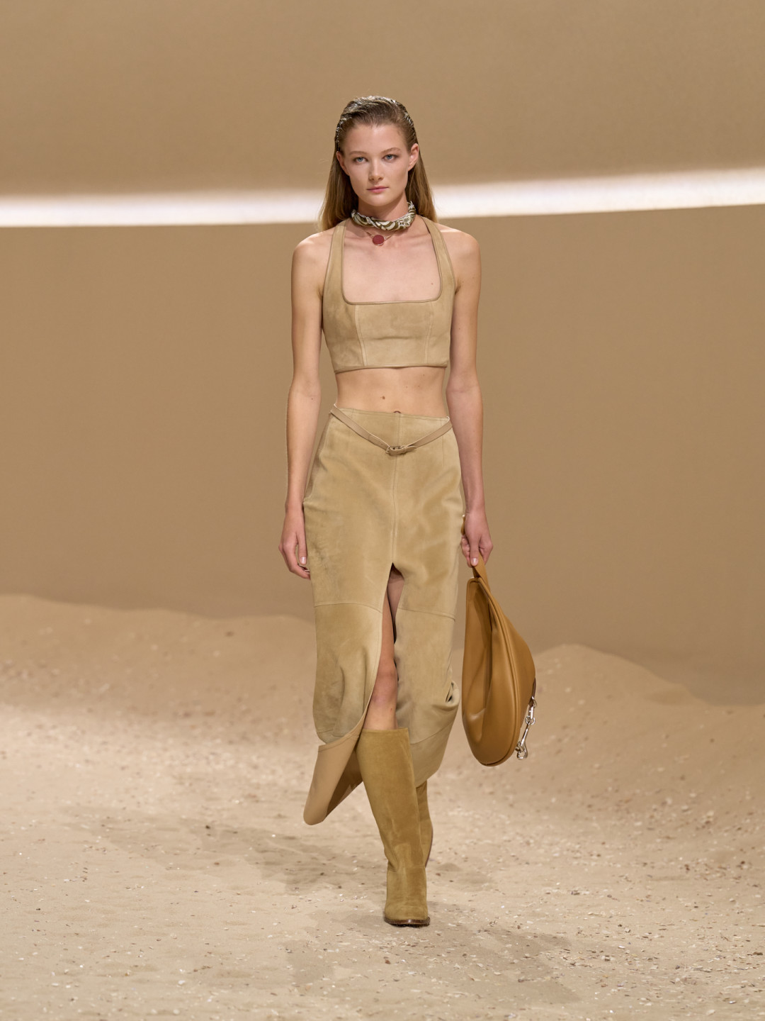 Кони также ассоциируются у Надеж Ване-Цыбульски со свободой. Поэтому и сами наряды словно пропитаны духом вольности и независимости. Но образ наездницы тоже не был утерян. Кожаные топы, напоминающие портупею, стали центральным элементом аутфитов. Они не только дополняют «луки», придавая им ноты сексапильности, но также служат для создания полноценного предмета гардероба в паре с шелковыми платками. Богемные принты шарфов располагаются еще и на утепленных плащах и сумках, протягивая трос между основными ДНК Дома и современностью. Кожа, как и всегда, стала акцентной частью коллекции, но на помощь ей в новом сезоне приходят также мягкая замша, плотный хлопок и твил.